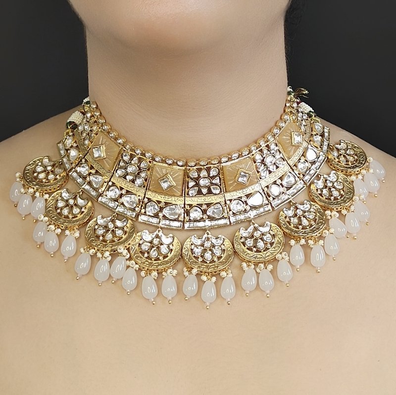 22 Kt Gold Plated Miraan Choker Set made with Uncut Artificial Polki beaded with light pink Beads .