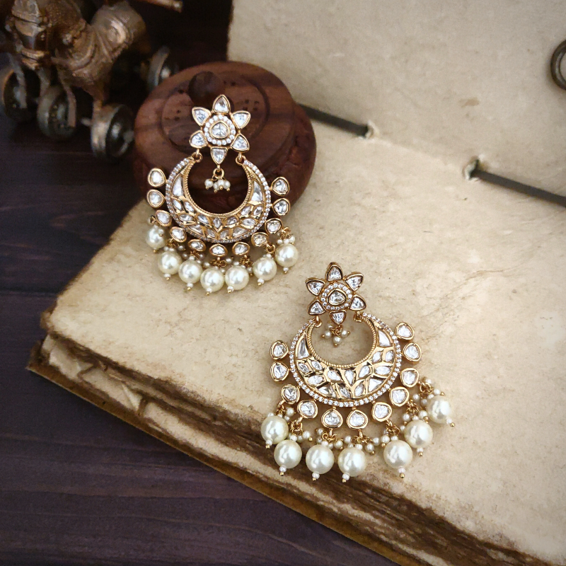 14 Kt Rose gold plated Miral chaandbali studded with uncut polki and beaded with White pearls.