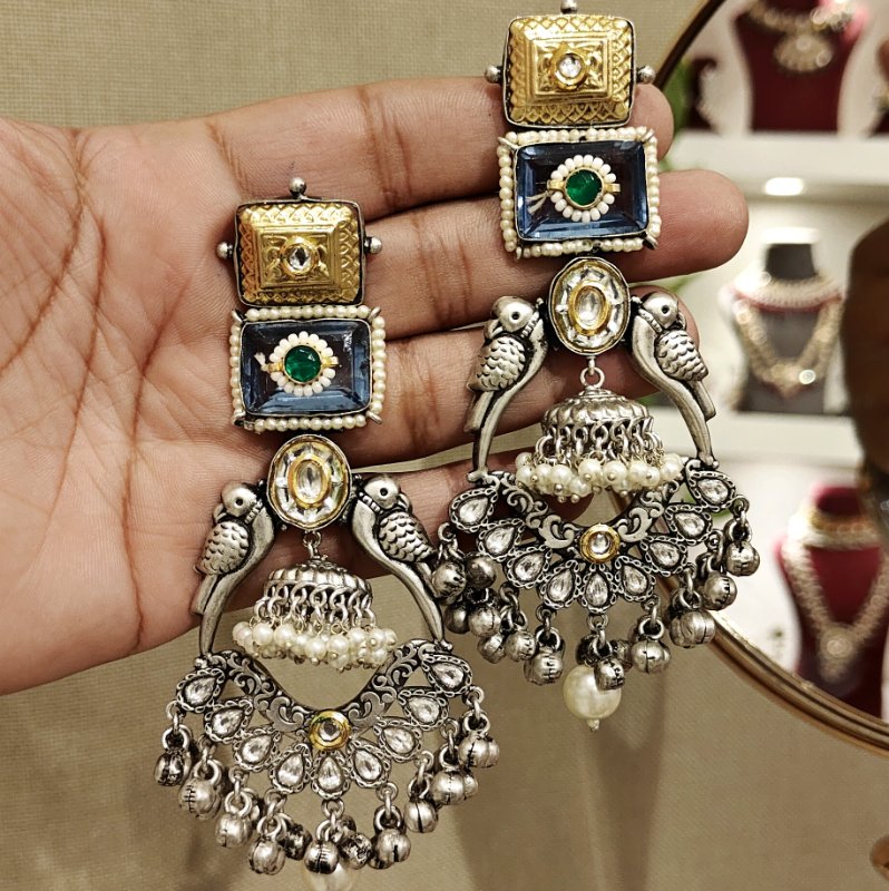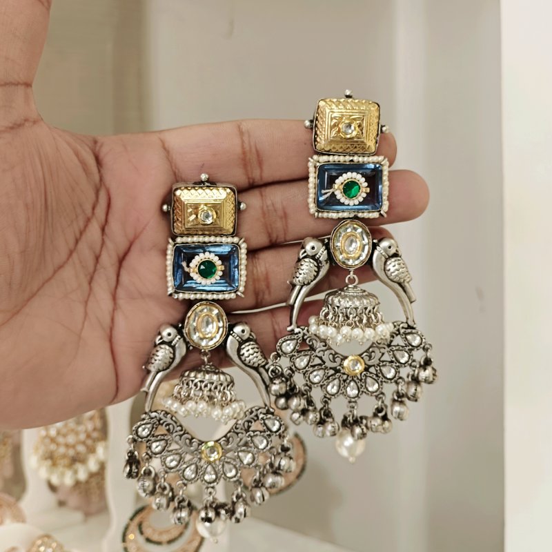 Antique silver and gold plated statment danglers in bird design , studded with polki and skyblue faceted stones . these earrings are beaded with pearls at the bottom .