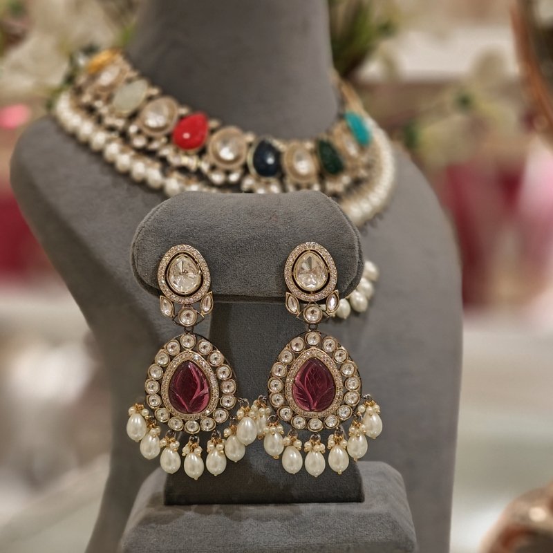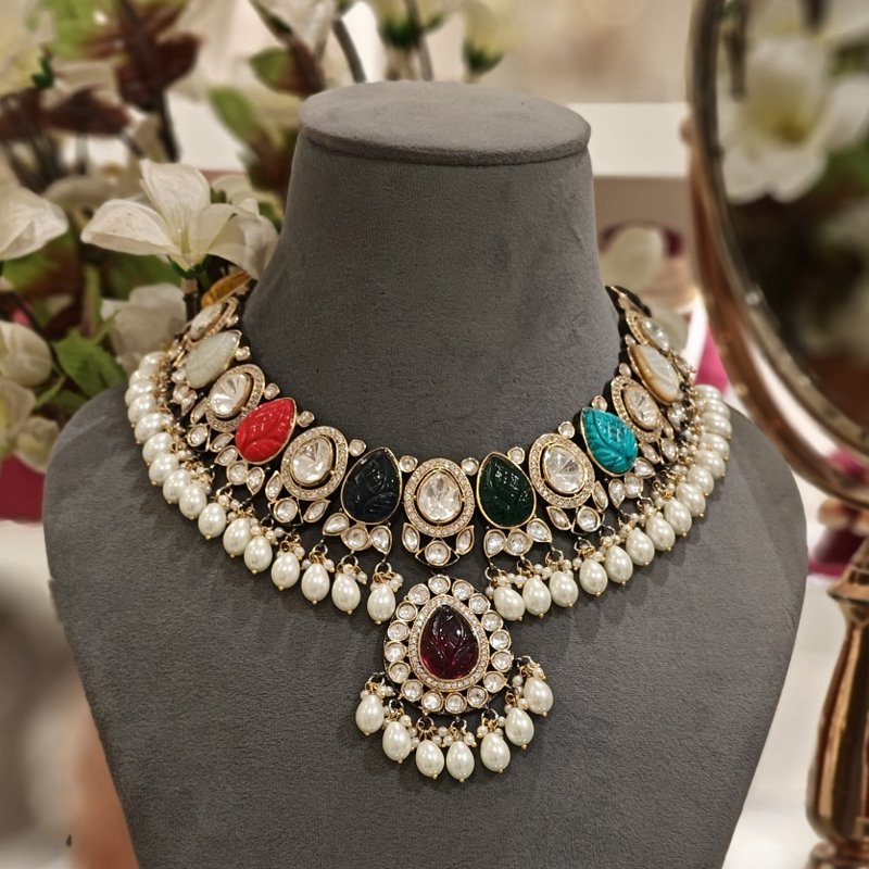 The Mridula set is meticulously crafted using the finest uncut lab grown polkis, which is then cratfed with semi precious navrattan stones and plated with a luxurious black and 18 kt gold colour to add more charm to it. To create this ornate piece of beauty even more special, the necklace is integrated with drop pearls at the bottom .