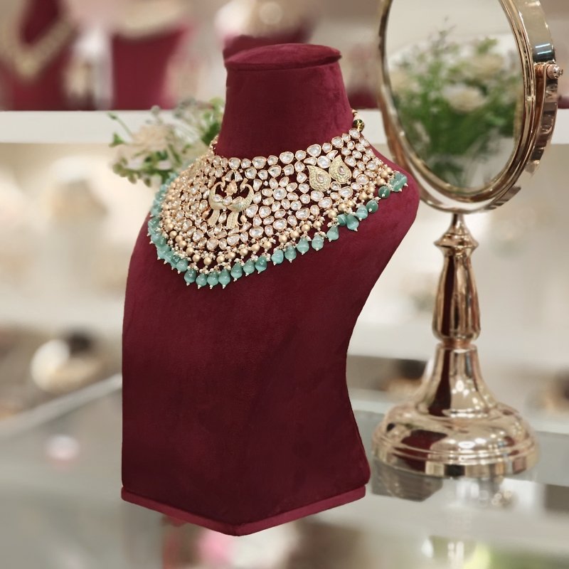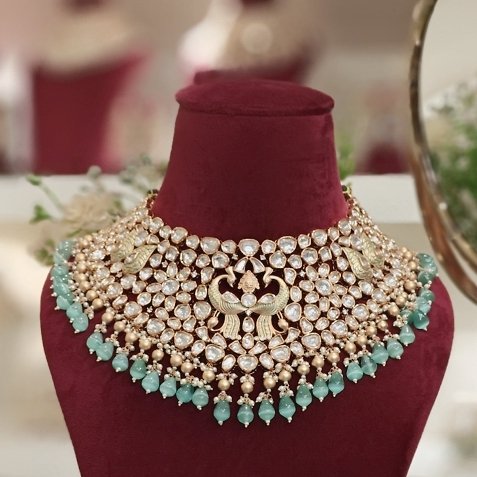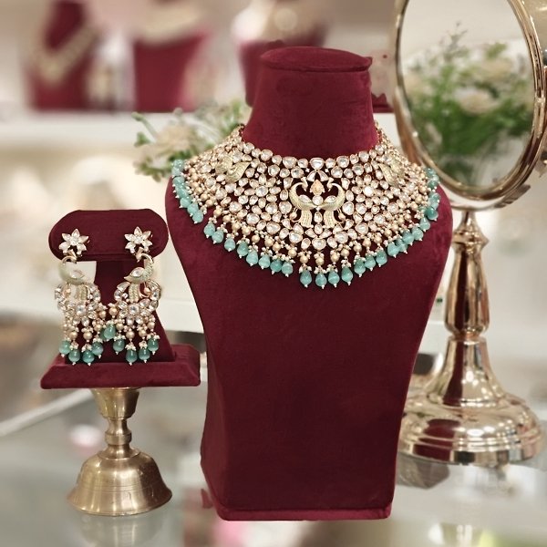 Mrignayni set is Crafted in the finest uncut artificial polkis and adorned with exquisite 18 kt gold plating. The intricate design offers an alluring peacock motif that beautifully captures the essence of grace and poise, while the mesmerizing mint green beading creates a mesmerizing charm that’s hard to resist. Perfect for the modern-day bride who desires to add a touch of traditional elegance to her special day, this exquisite choker set is sure to take your breath away.