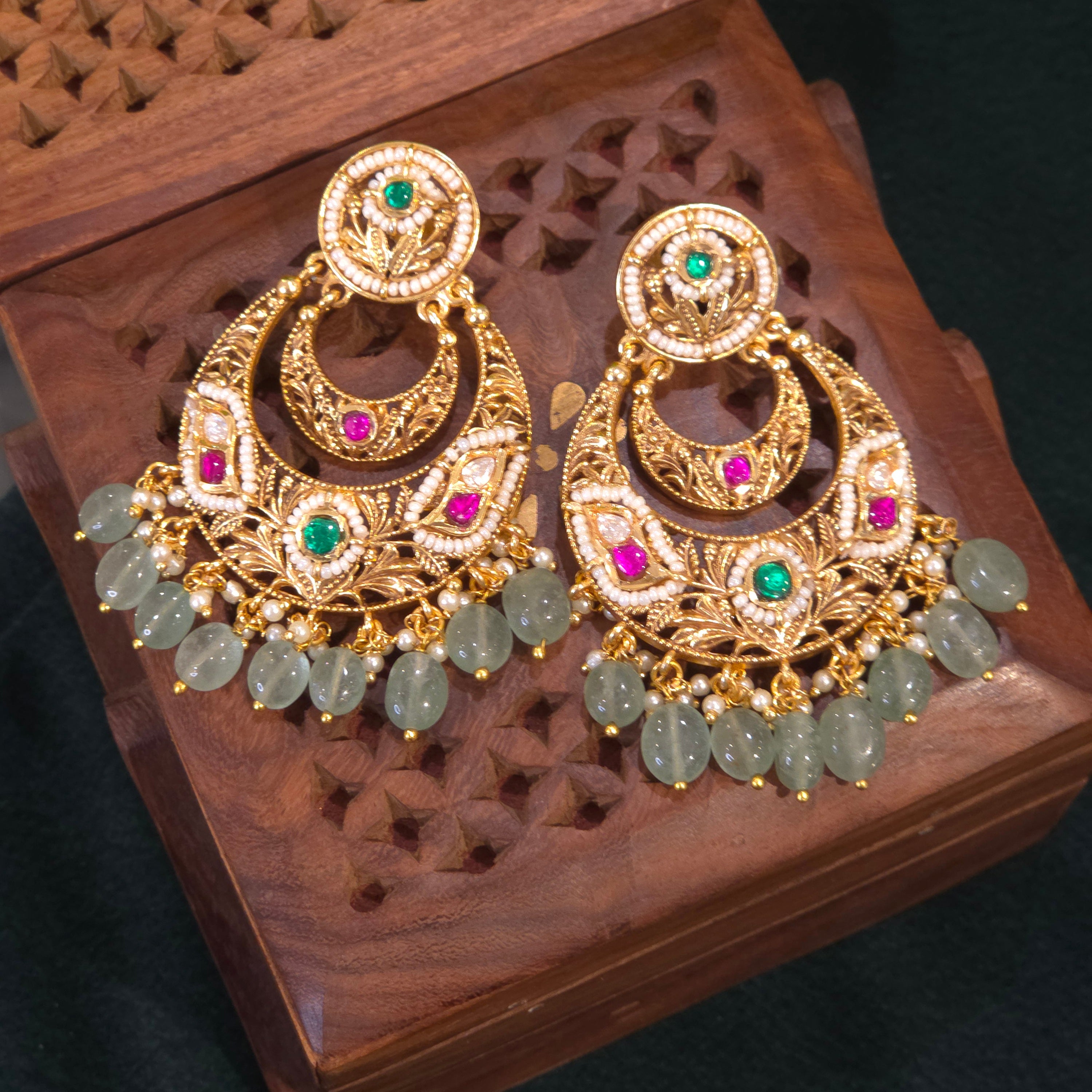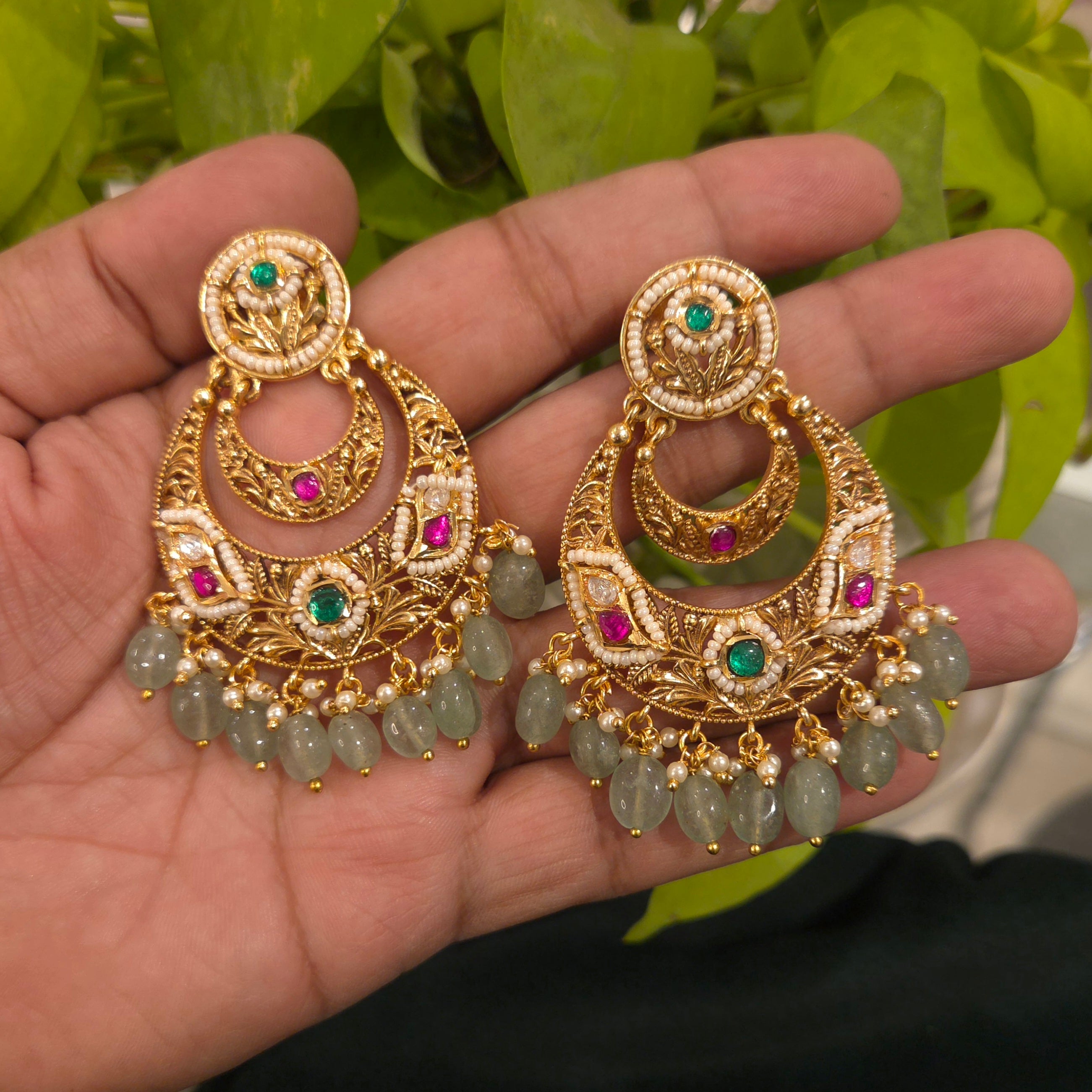 Add a touch of elegance to your outfit with the Murthi antique chaandbali. Made with mixed metal alloy and plated in 22 kt gold, it features stunning ruby and green pota stones with small moissanite polki, surrounded by white pearls and beaded with micro pearls and emerald strawberry beads. Elevate your style with this beautifully crafted accessory.
