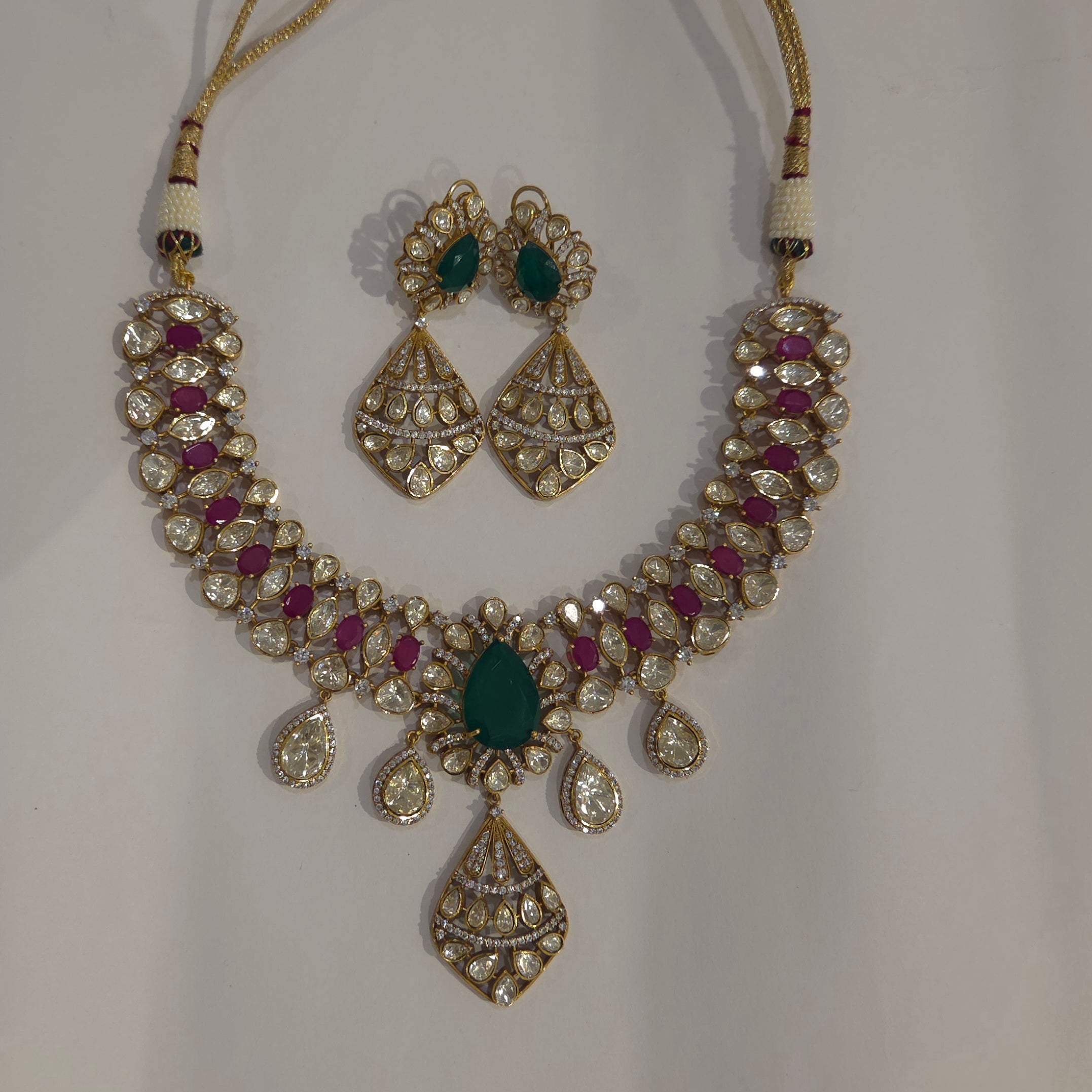 Myra statement necklace set is made with moissanite polki gemstones and crafted in mixed metal alloy with little content of silver ,above is 22 kt matt Gold plating. Stones used are doublet with natural inclusion