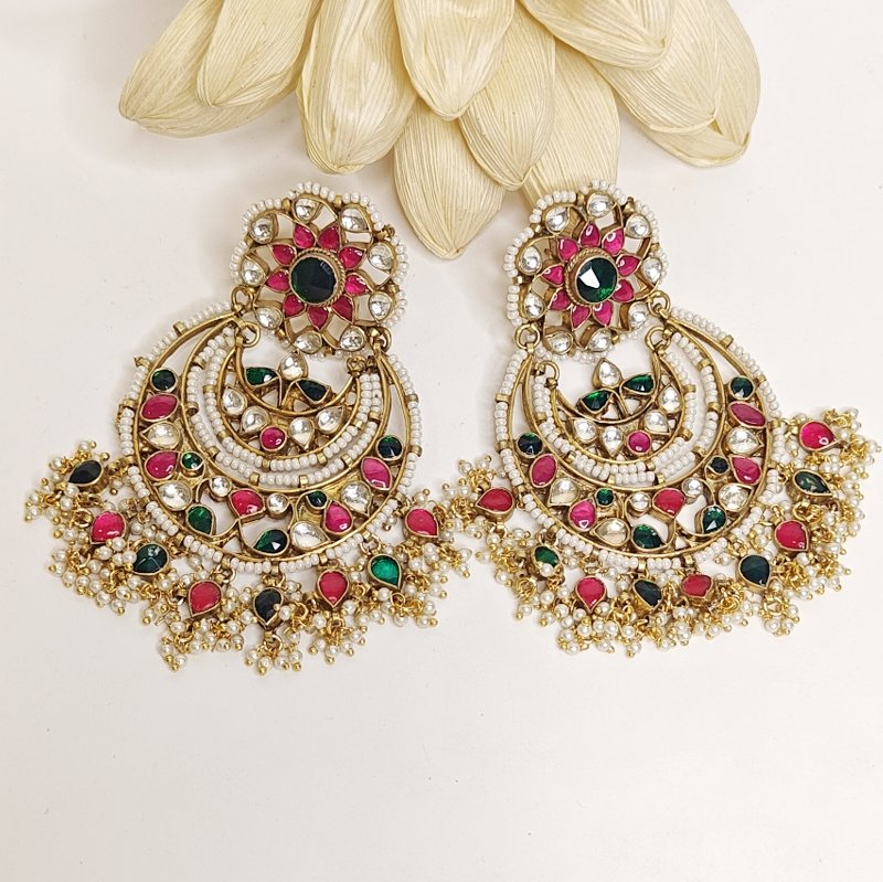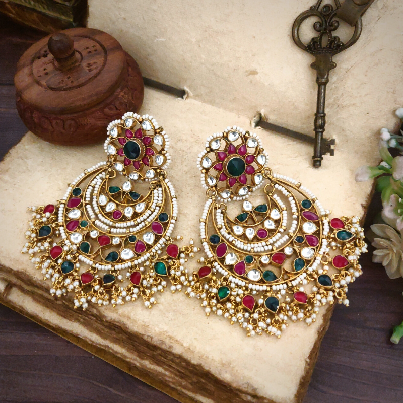 22 kt Gold plated Nadira Earrings, Made in Multicoloured Ahmedabadi Paachi kundan and beaded with emerald coloured beads & pearls .