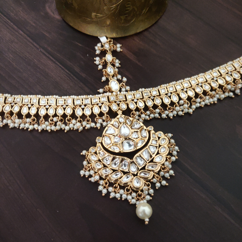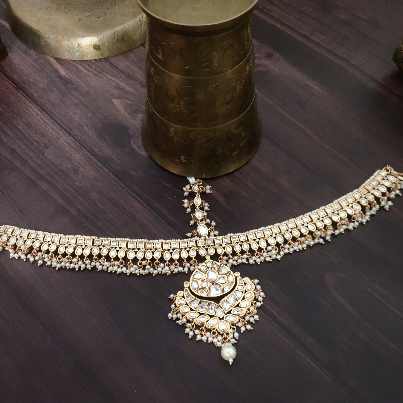 Elevate your look with this exquisite sheeshpatti that boasts artificial polki embellishments. The piece includes a stunning maangtikka and is adorned with delicate pearls, all finished off with an 18 kt gold plating. Experience the pinnacle of quality with this stunning Hair accessory!