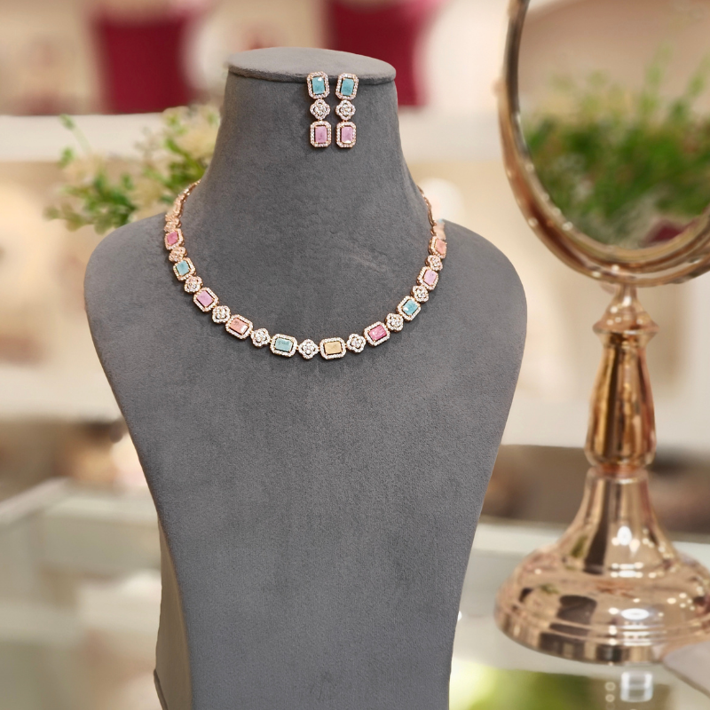 This elegant indo western necklace set features all pastel coloured shimmering stones in emerald cut shape and plated in 14 kt gold .