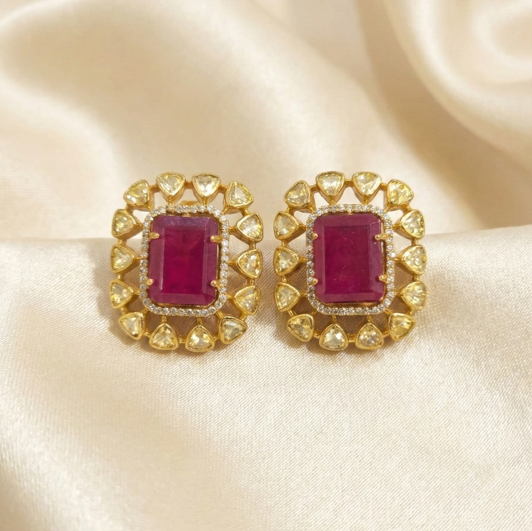 These moissanite polki studs feature moissanite polki set in a durable mixed metal alloy, plated in a dark matte gold finish. The design includes secure screw back with Bombay clasp at the back . These elements enhance comfort and ensure reliable wear.