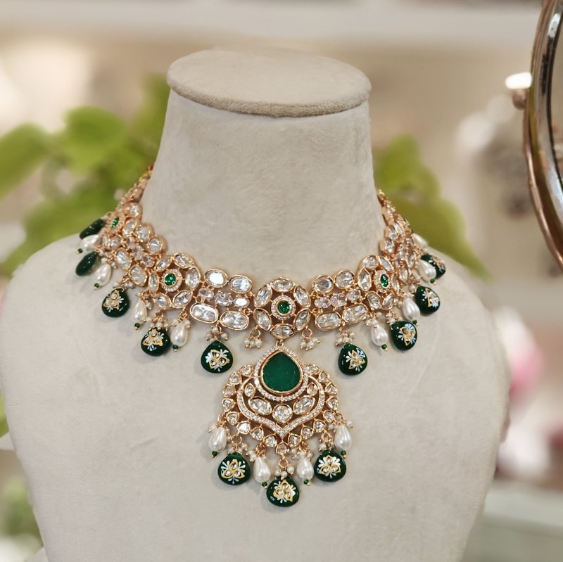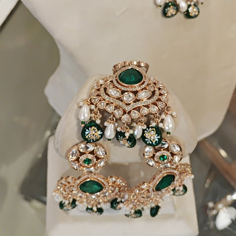 This stunning uncut Polki set features a tanzor design, elegantly paired with matching earrings and maang tikka . The pieces are beautifully studded with vibrant red hydro stones and sparkling cubic zirconia (CZ), creating a perfect blend of traditional and contemporary charm.