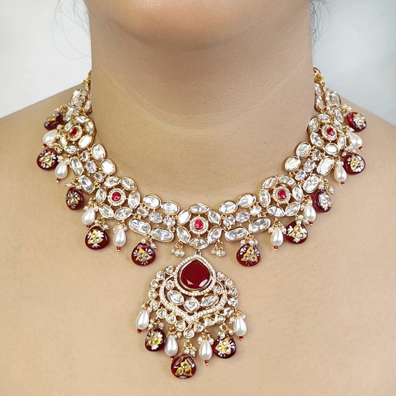 This stunning uncut Polki set features a tanzor design, elegantly paired with matching earrings and maang tikka . The pieces are beautifully studded with vibrant red hydro stones and sparkling cubic zirconia (CZ), creating a perfect blend of traditional and contemporary charm.