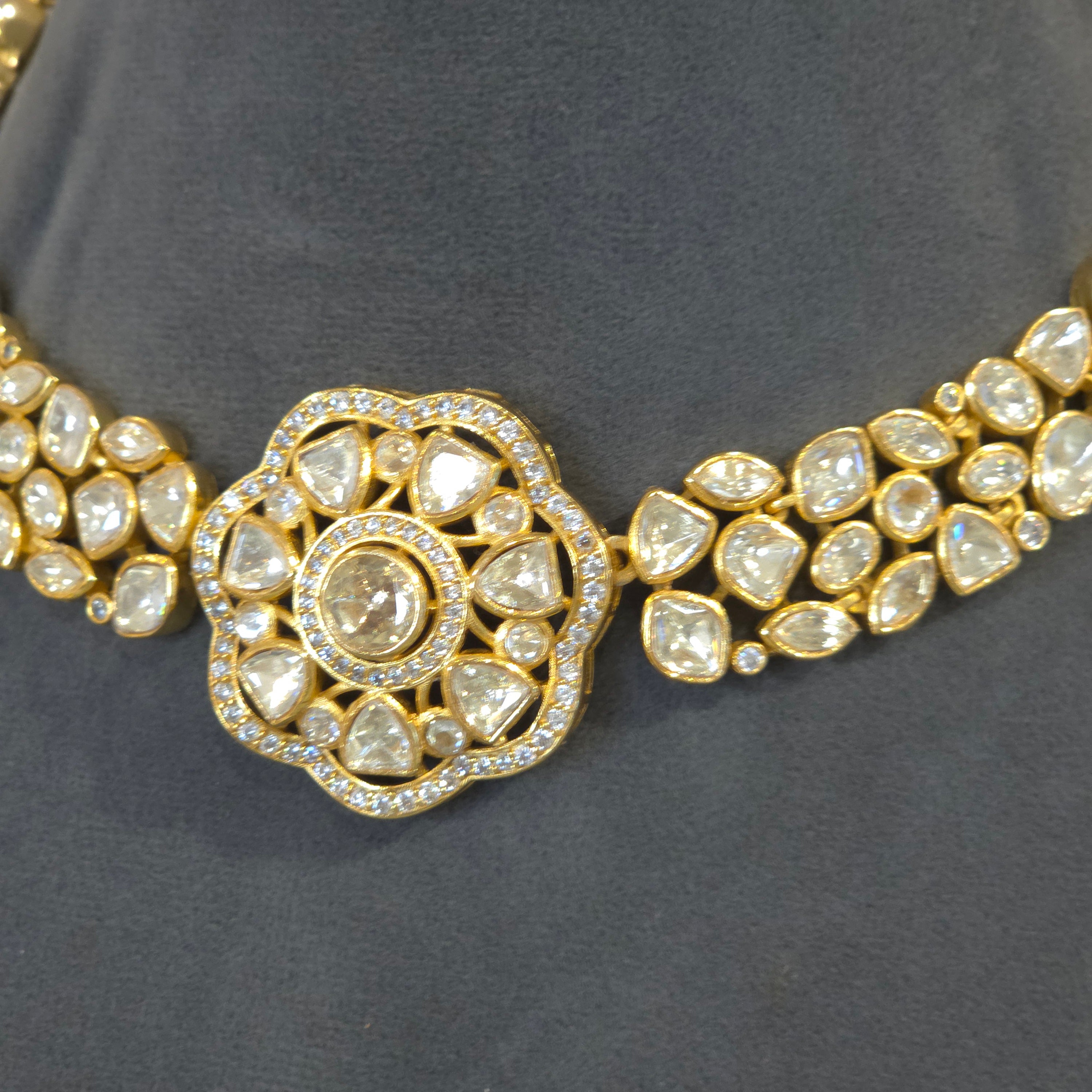 The Nancy moissanite polki set features a 22 kt gold plated necklace and earrings, expertly crafted from brass silver mixed metal alloy. The uncut moissanite polkies enhance it's Lustre and durability, while the screw-back earrings provide a secure fit, making this set ideal for both formal and casual occasions.