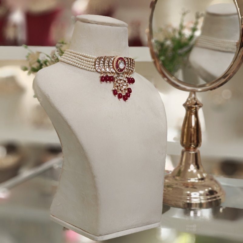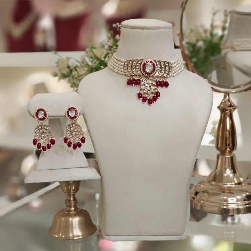 The Nandita choker set is made with ruby baguatte and artificial polkies beaded with white pearls and ruby red stones .