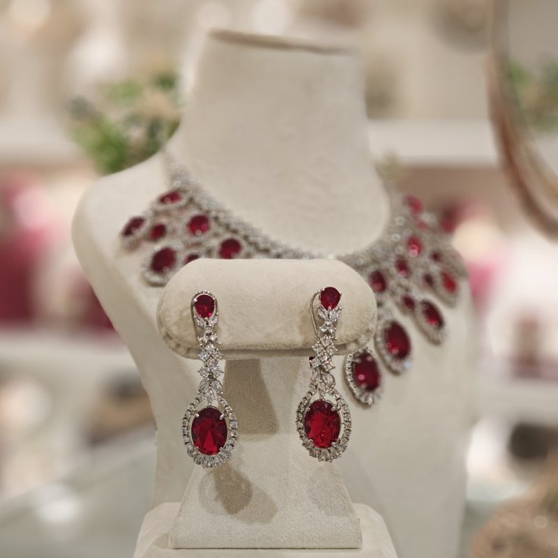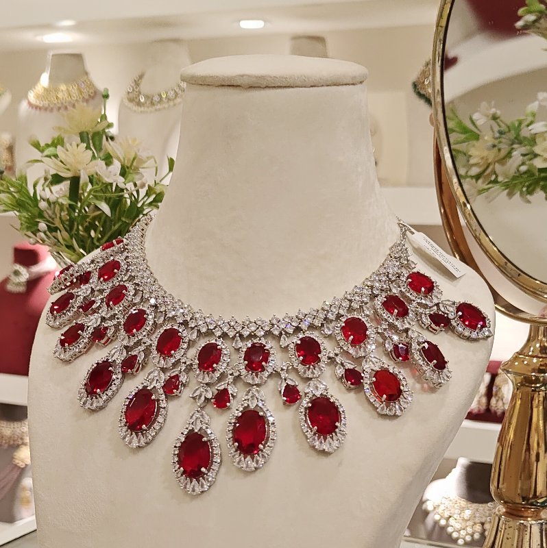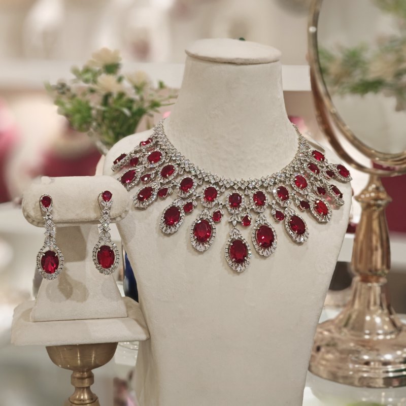 A stunning set featuring an Indo-Western neckline and long dangling earrings crafted with CZ and ruby red hydro faceted stones, all coated in sleek white rhodium plating.Earrings are having bombay clasp at the back.