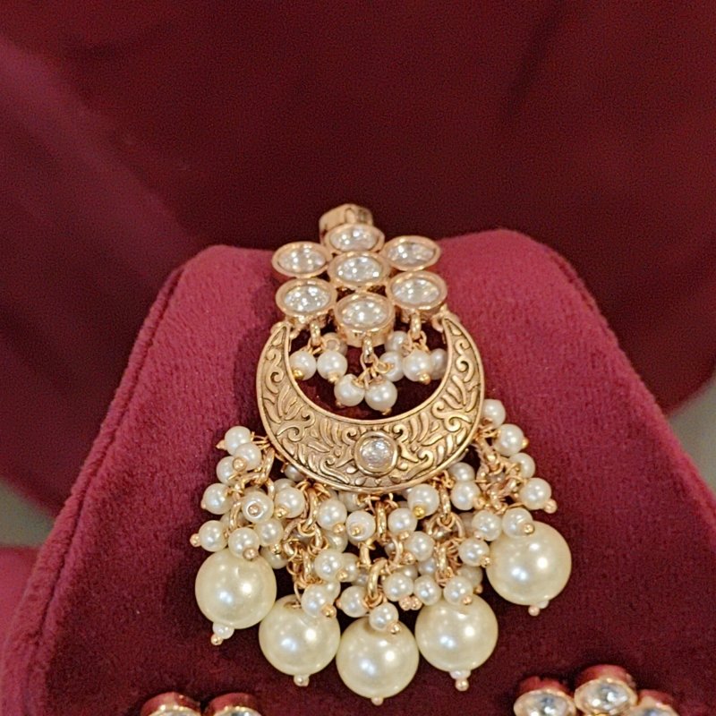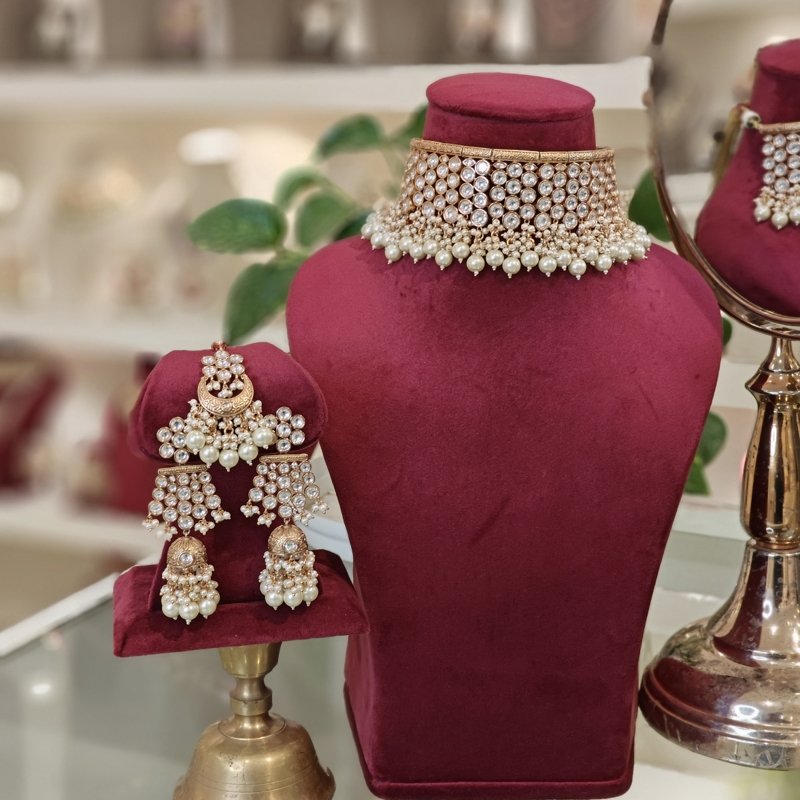 This exquisite bridal choker necklace set is a true masterpiece, studded with uncut CZ Polki stones and sparkling cubic zirconia. Beaded finely with pearls, it exudes timeless elegance and luxury, making it the perfect choice for brides seeking a blend of traditional charm and contemporary brilliance.