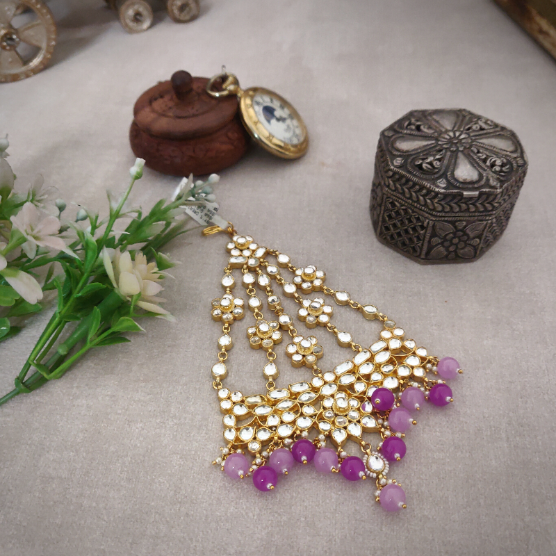 Neelam Passa consists of Lavender and purple beads adorned with micro pearls and is embellished with Paachi Kundan stones and plated in 22kt micron plating .