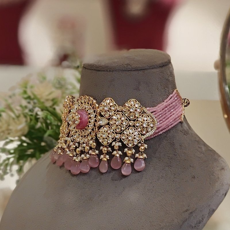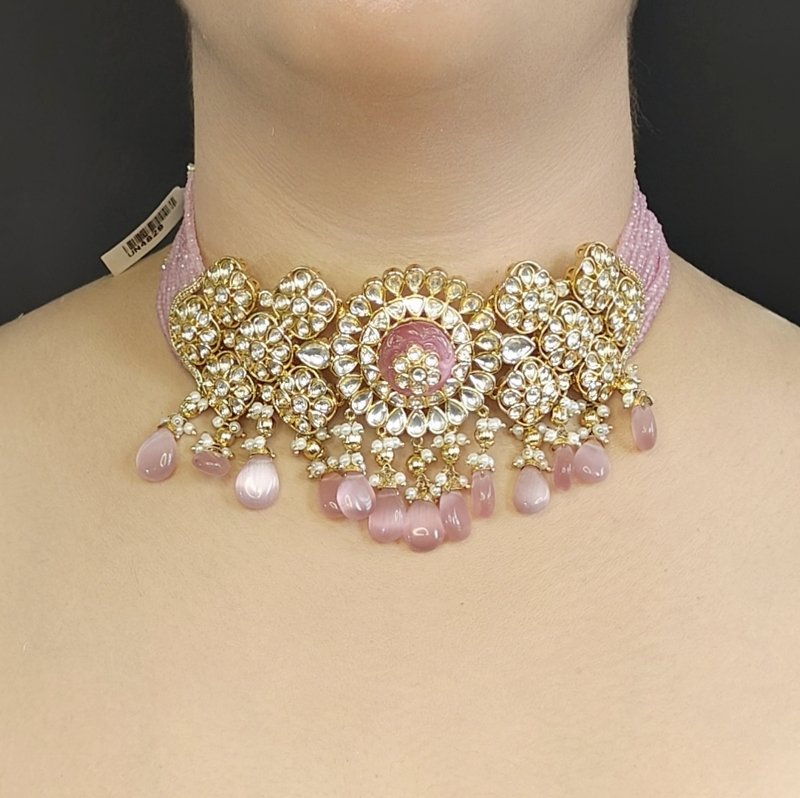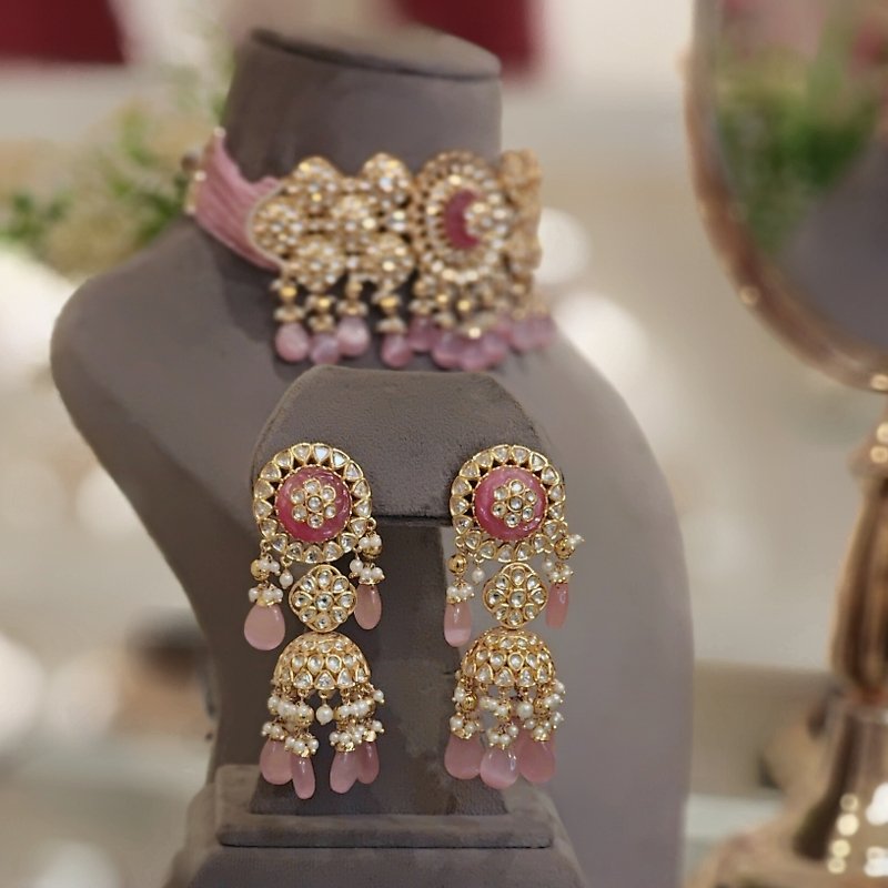 This remarkable set comprises a choker and jhumka, featuring uncut polkies that create a stunning and detailed design. The choker is adorned with baby pink monalisa stones, making it a truly beautiful piece of jewelry.