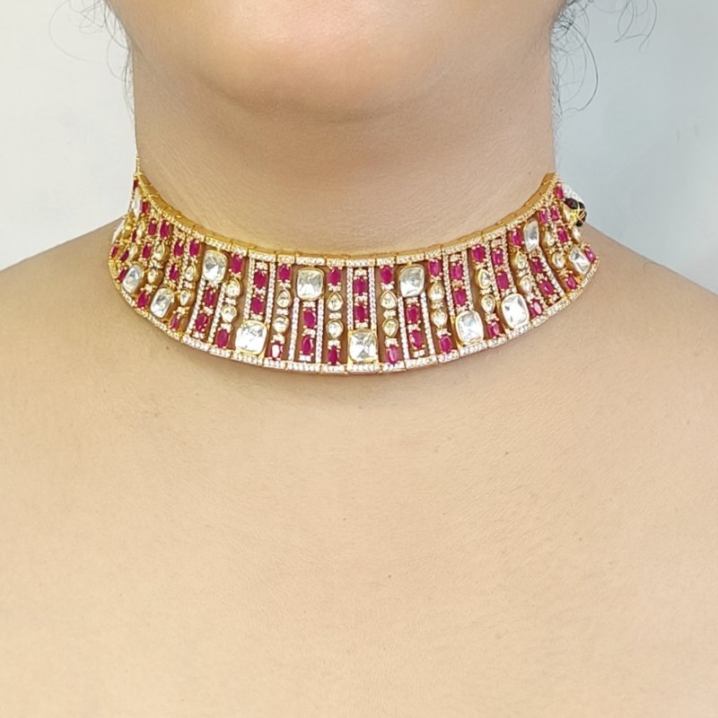 This lightweight gold-plated choker set is studded with ruby creative stone along with shimmering golden Moissanite polki, surrounded by sparkling CZ stones. Its delicate design makes it a beautiful and versatile piece, perfect for adding elegance to any occasion while offering both comfort and style.