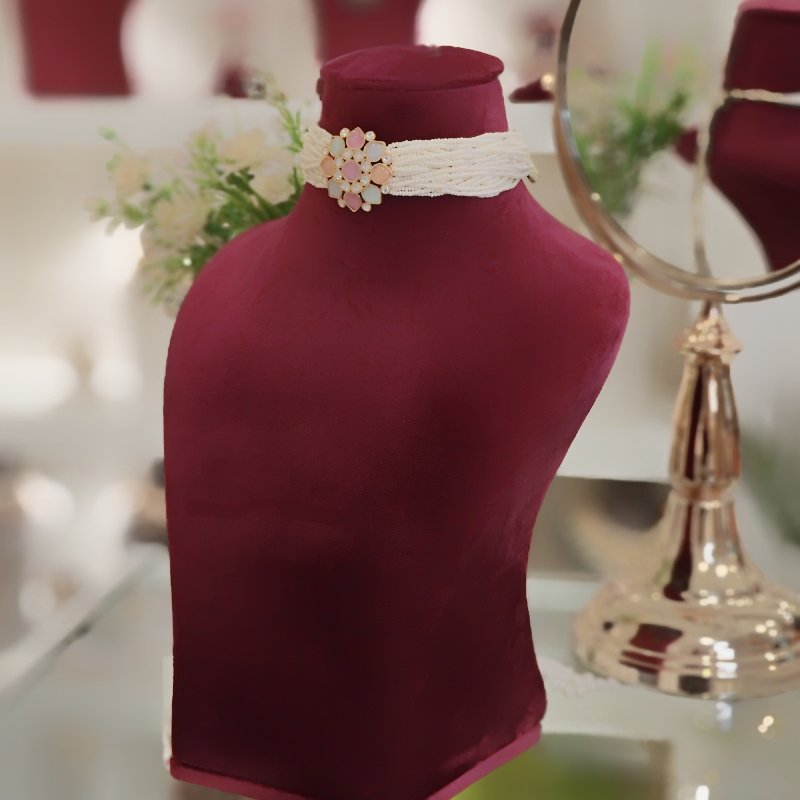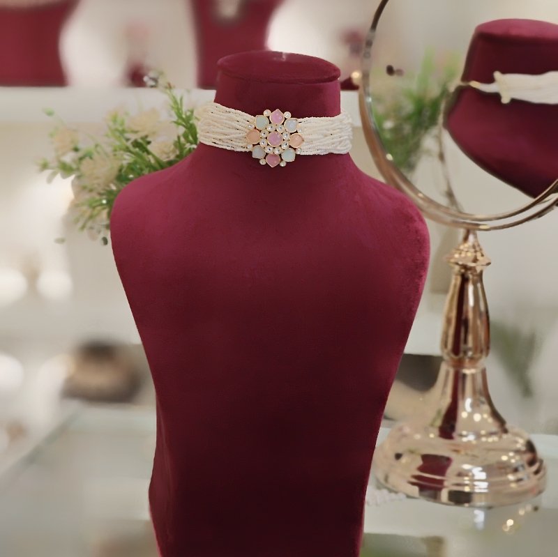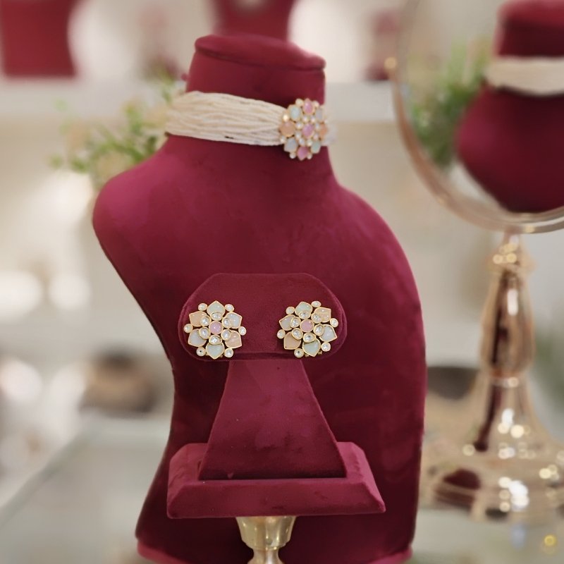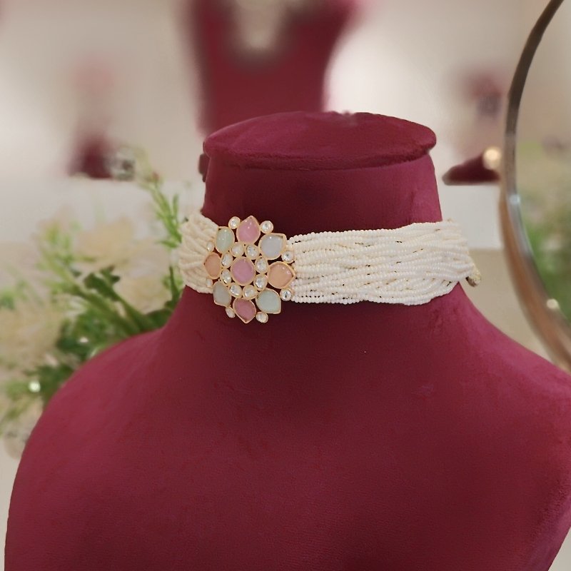 A beautifully crafted choker set adorned with pearl beads, featuring a soft and subtle array of pastel colors, coupled with a pair of stylish studs.