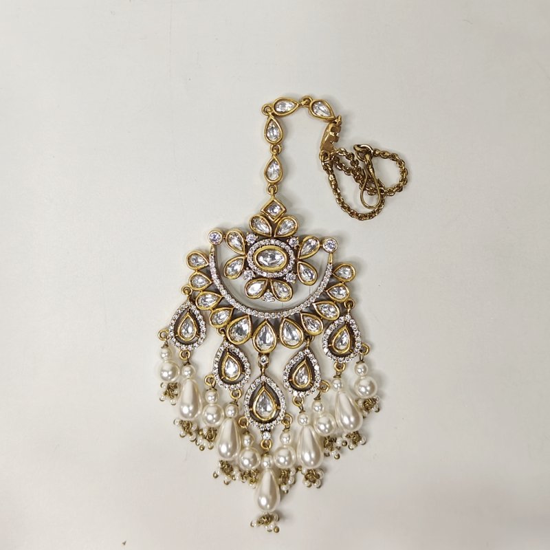 A stunning maangtikka featuring fusion of cz and polki gems , and beautifully beaded with pearls stones .This tikka is plated in luxurious 14 kt gold , silver and black rhodium polish .