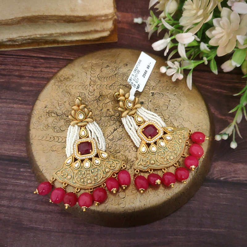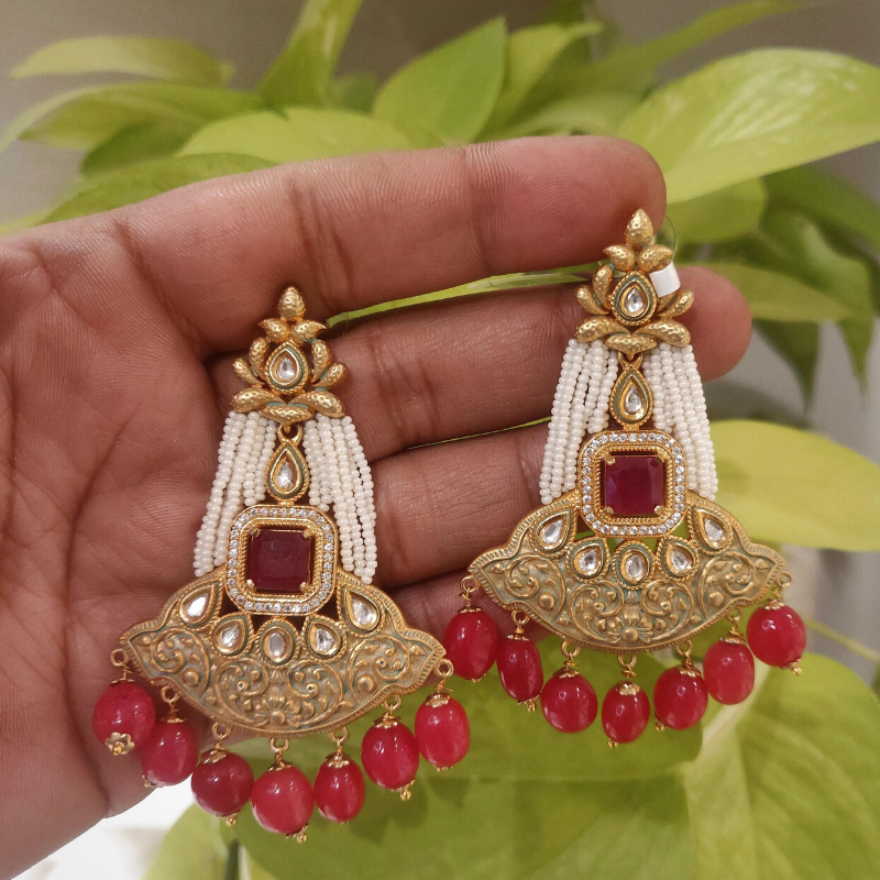These earrings are dangled and made with an antique gold plating, featuring princess cut stones in a ruby hue. CZ and polki accents are included, and the earrings are additionally adorned with rose pink beads