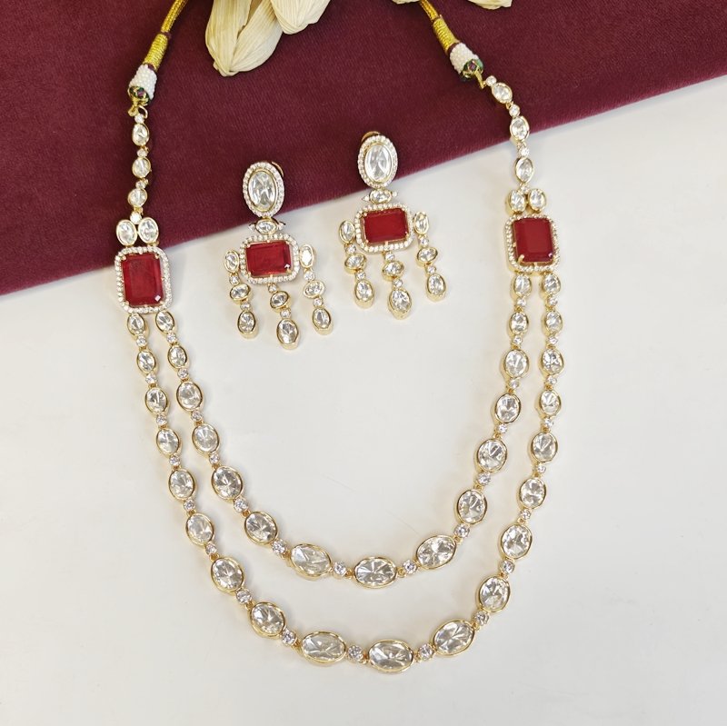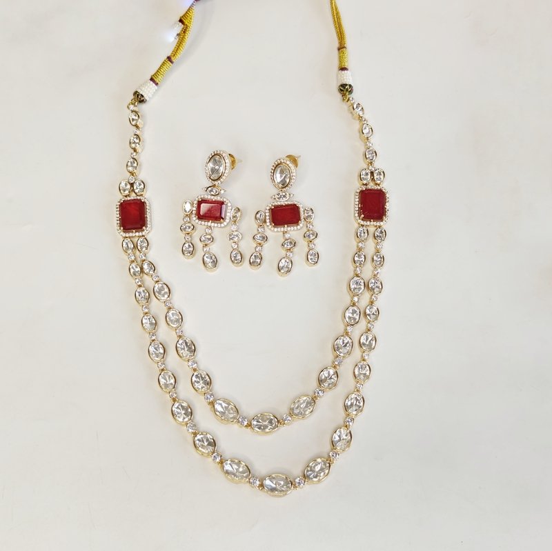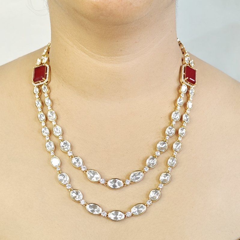 A gorgeous double-line bridal necklace set featuring Kundan Polki stones with green meenakari work around it . Plated in 22kt gold and crafted from a mixed metal alloy, this set beautifully combines traditional elegance with modern design.