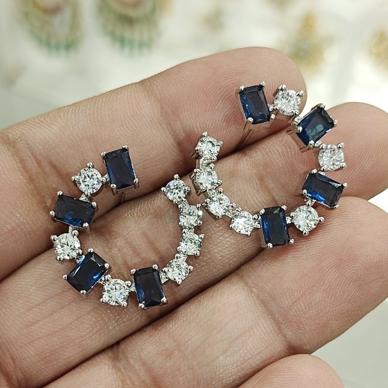 These studs are made in clear and blue cz stones , plated in white rhodium polish .
