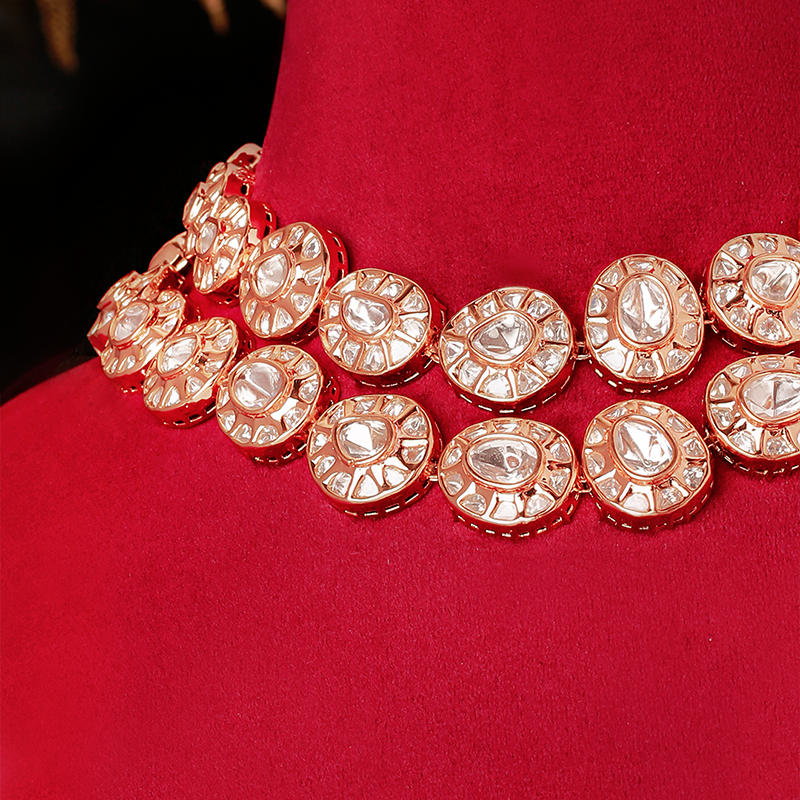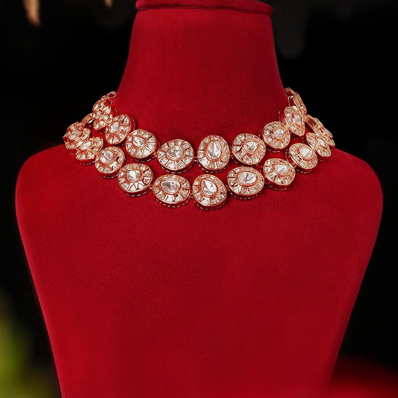 A spectacular bridal set comprising of a statement neckline and jhumka crafted with artificial polkies in a two-layered royalty design, embellished with micro pearls in jhumkas.
