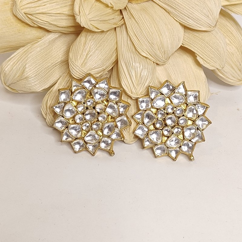 These large sized studs are made in mixed metal alloya and plated in 22 kt gold . These studs are studded with kundan stones and made in paachi kundan workmanship.