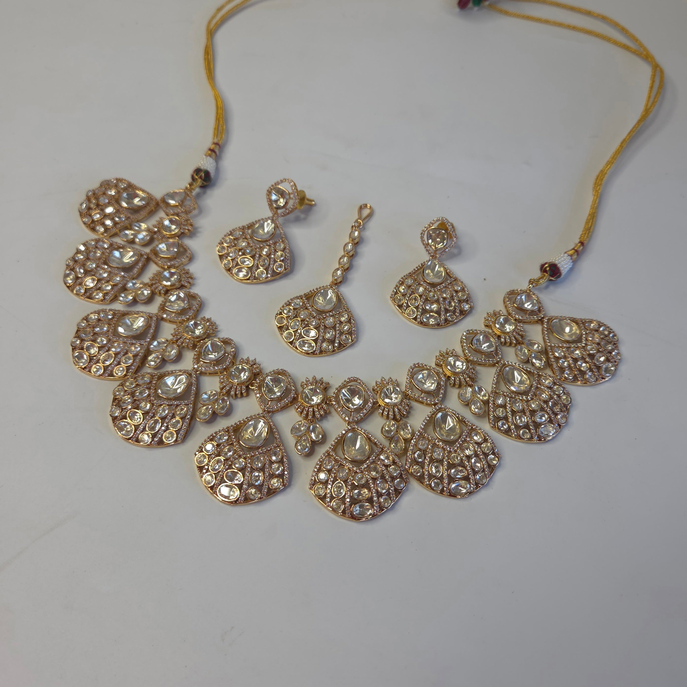 This exquisite piece, crafted with moissanite polki and finished with a beautiful rose gold plating, offers remarkable versatility. It will undoubtedly add a touch of elegance to your Indian attire. Furthermore, its design seamlessly complements indo-western outfits, making it a truly adaptable accessory.