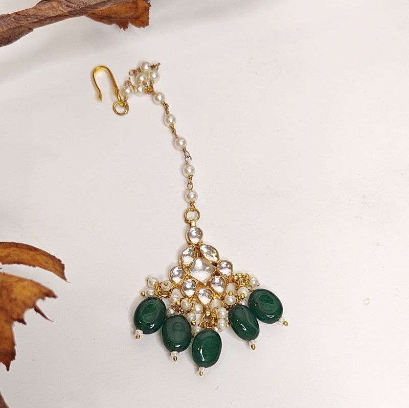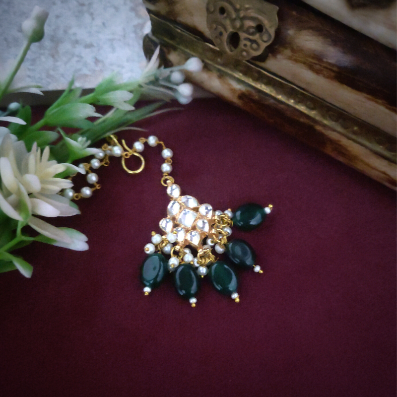 22 Kt Gold Plated Norah Maangtikka ,Made in Ahmedabadi Paachi kundan and embellished with Emerald green coloured beads .