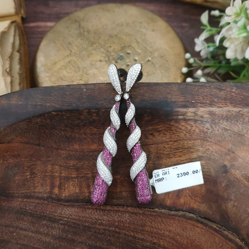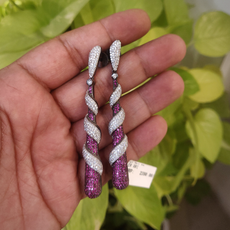 Long drop shaped earrings are fashioned in a spiral design featuring dark lavender zircons, complemented by black and white rhodium.