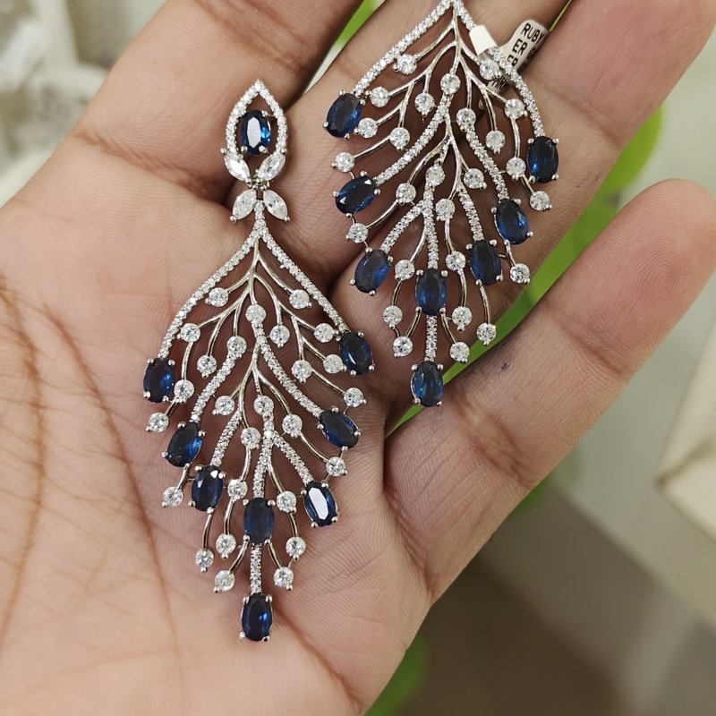 The stunning earrings is made in tree branches design with combination of royal blue hydro along with clear cz stones , all plated in silver rhodium to give it rich and real diamond look .