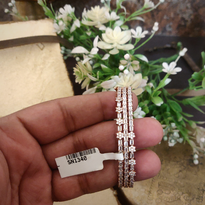 A captivating bracelet with a fusion of Indian and Western designs, embellished clear white cubic zirconia stones and plated in rose gold colour .