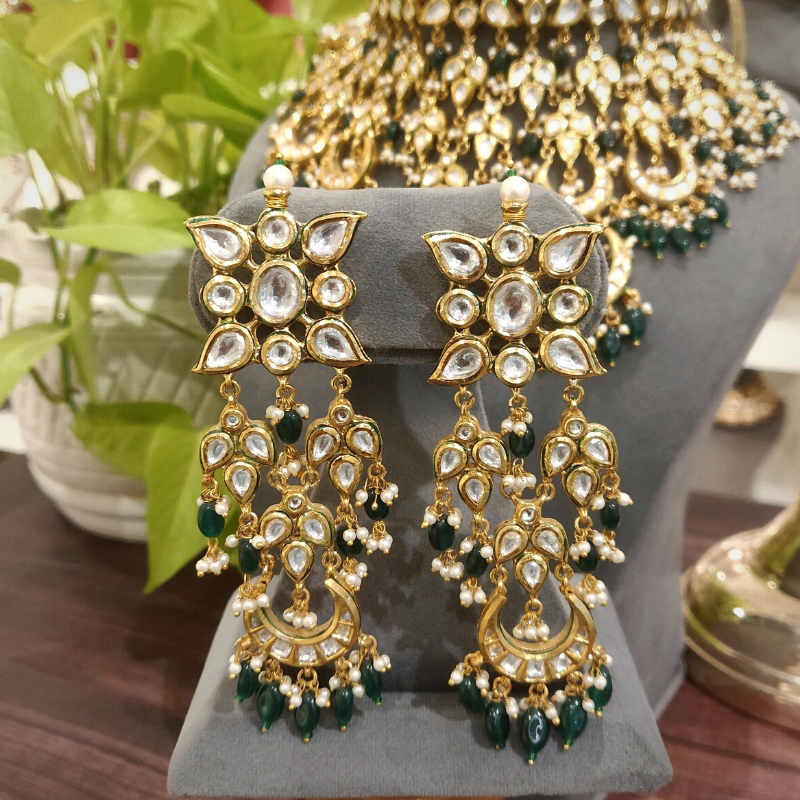 Crafted in Meenakari Kundan with elongated earrings adorned with Emerald Green beads, this set features a V-shaped design and serves as a perfect bridal choker set.