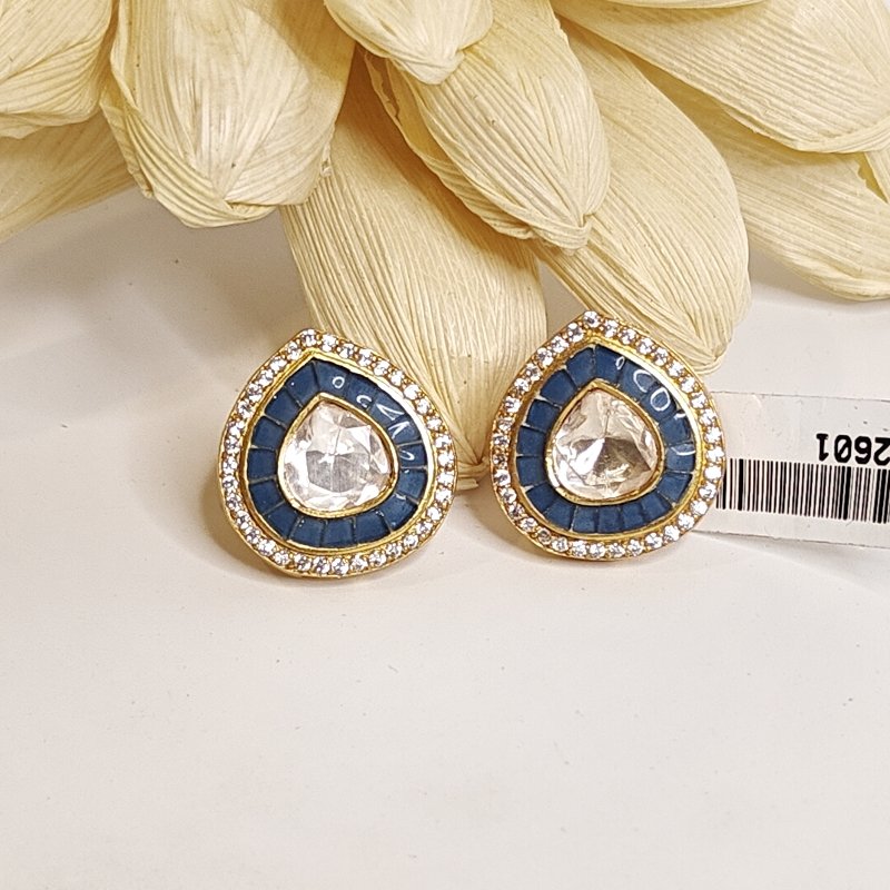 These medium-sized studs are meticulously crafted, featuring CZ and Moissanite Polki stones. They are encircled by blue pota stones in a Takkar setting, showcasing exquisite workmanship.