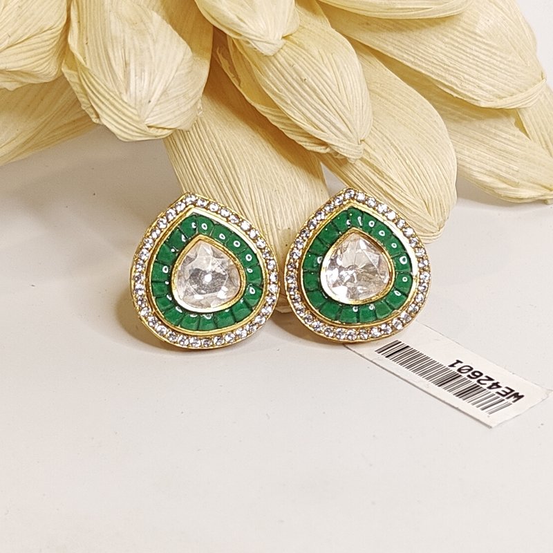 These medium-sized studs are meticulously crafted, featuring CZ and Moissanite Polki stones. They are encircled by emerald green pota stones in a Takkar setting, showcasing exquisite workmanship.