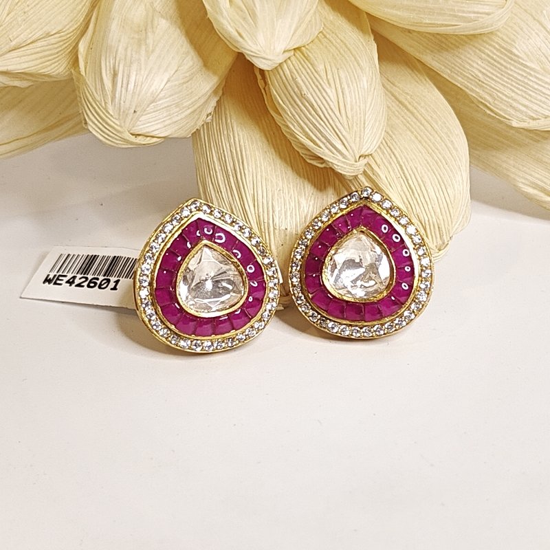 These medium-sized studs are meticulously crafted, featuring CZ and Moissanite Polki stones. They are encircled by ruby red pota stones in a Takkar setting, showcasing exquisite workmanship.