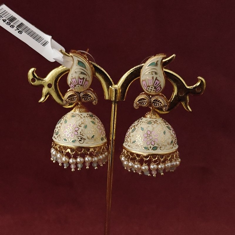 These small-sized jhumkas are adorned with sparkling polki stones and feature delicate pink and mint green enamel floral designs. Exuding charm and elegance, they offer a vibrant yet subtle touch to any outfit, making them a beautiful choice for both casual and festive occasions.