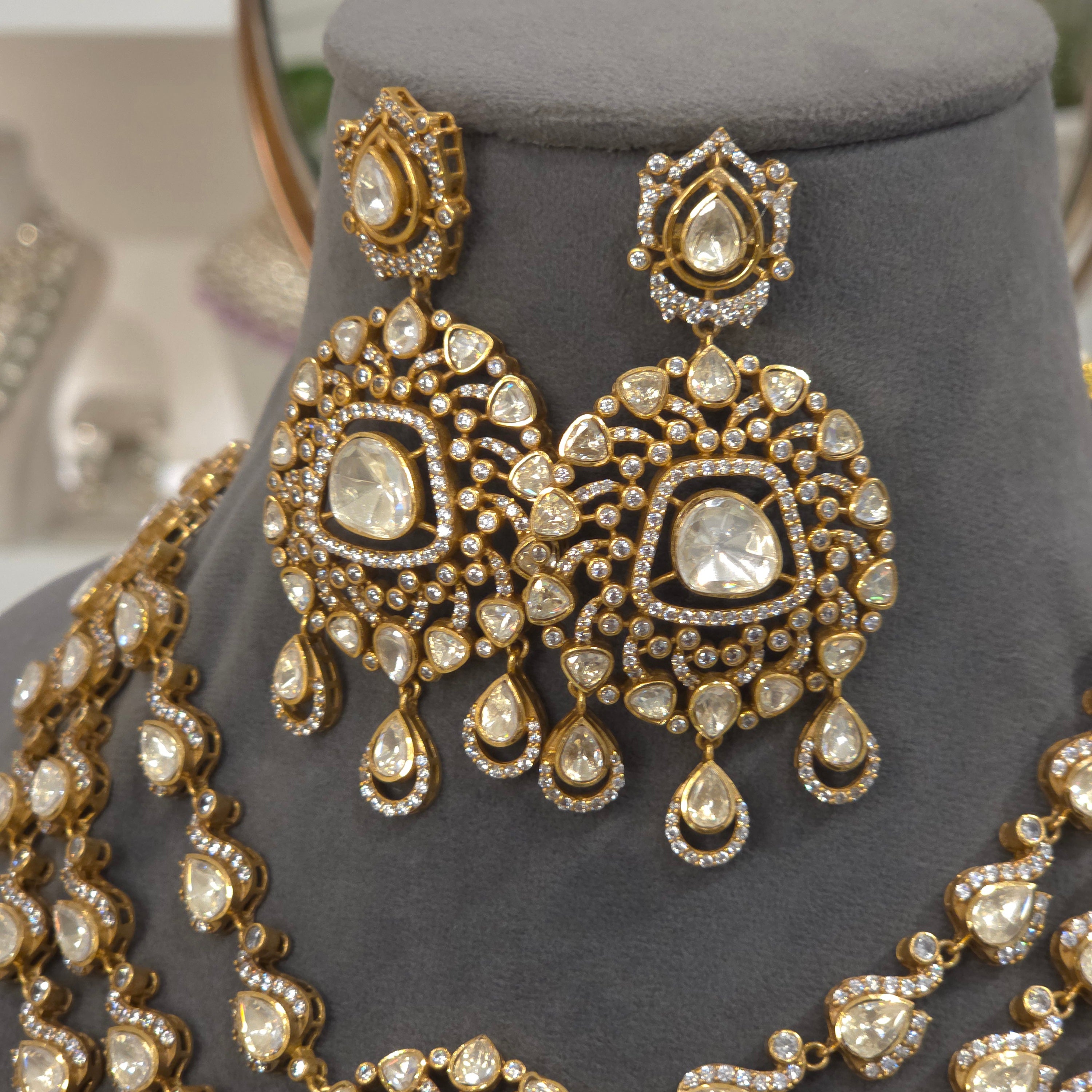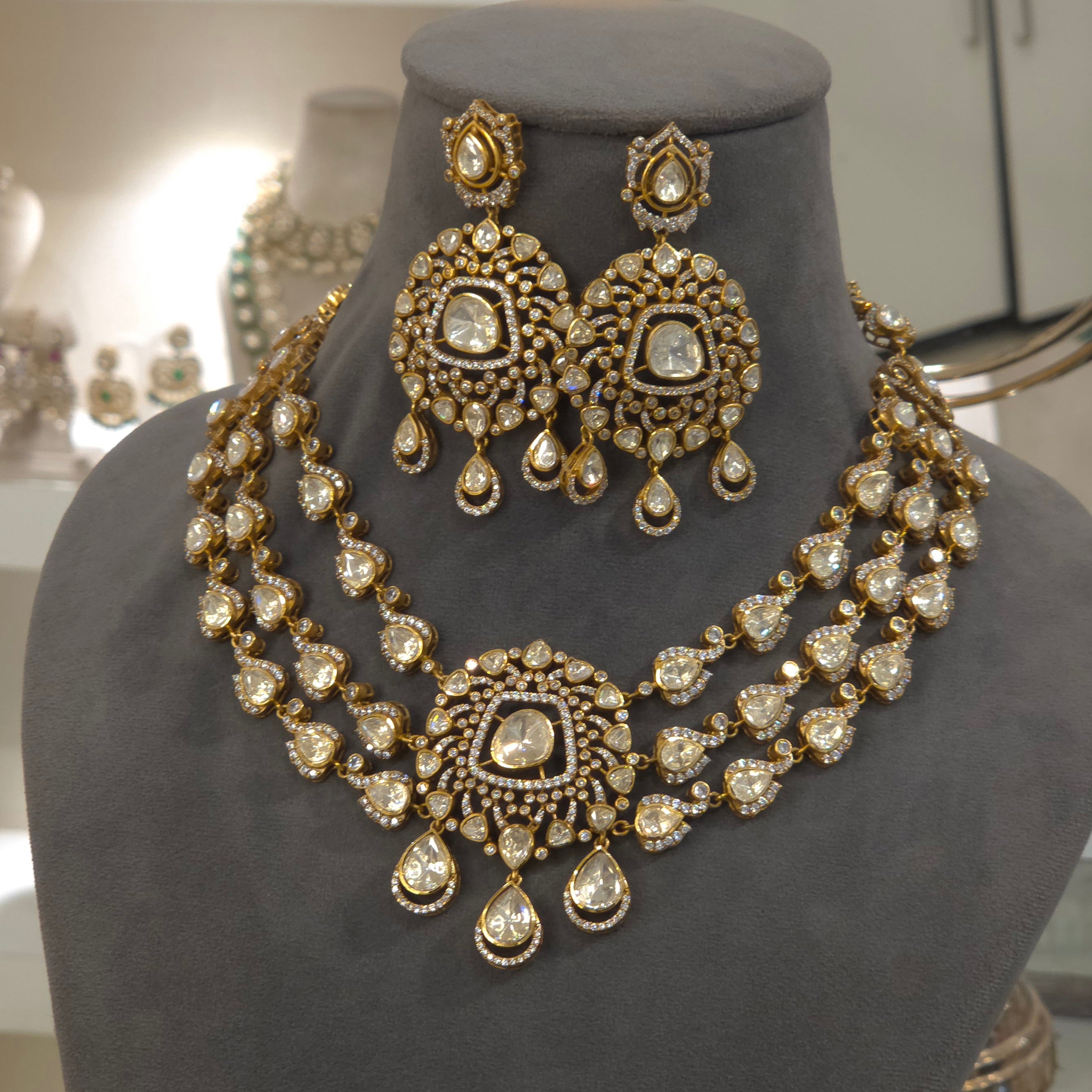 We are delighted to present the exquisite Parisha moissanite set, meticulously crafted with a sophisticated three-line design. This stunning piece features a beautiful central pendant, complemented by an amazing chaand bali for an added touch of elegance. It is expertly plated in lustrous 22-carat matt finish, ensuring a luxurious and enduring appeal. This set is sure to captivate with its intricate details and radiant sparkle. We are confident you will cherish this unique and beautiful creation.