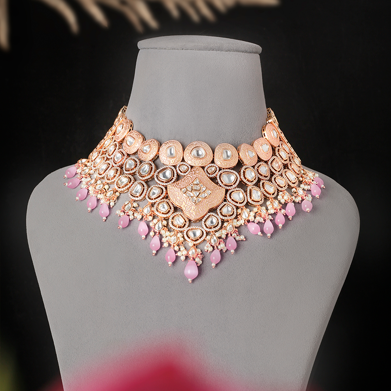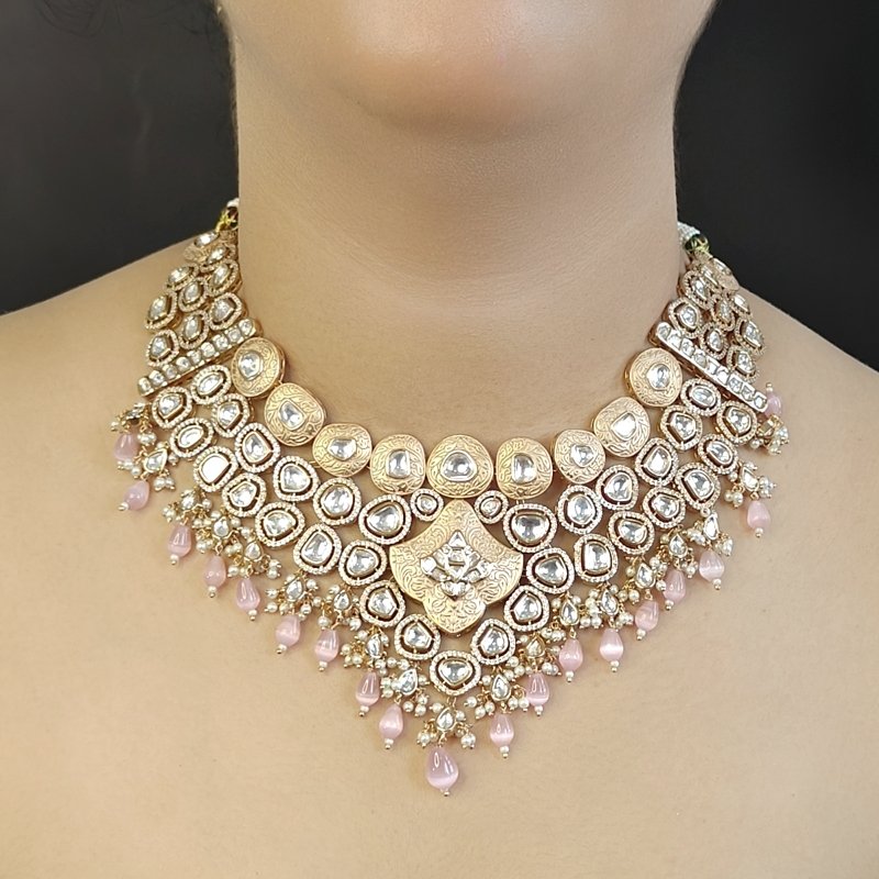 This sensational necklace set features an exquisite 18 karat gold plating, complete with a stunning polki neckline design. The charming pink enamelled finish is beautifully accented by delicate pink Monalisa drop beads, giving it a captivating and feminine touch.