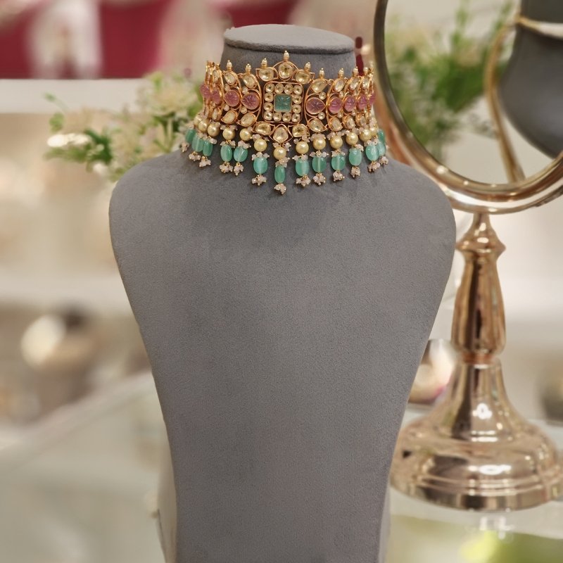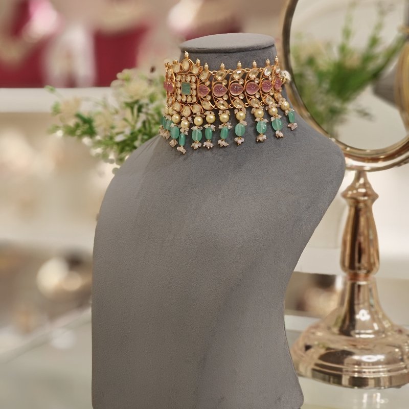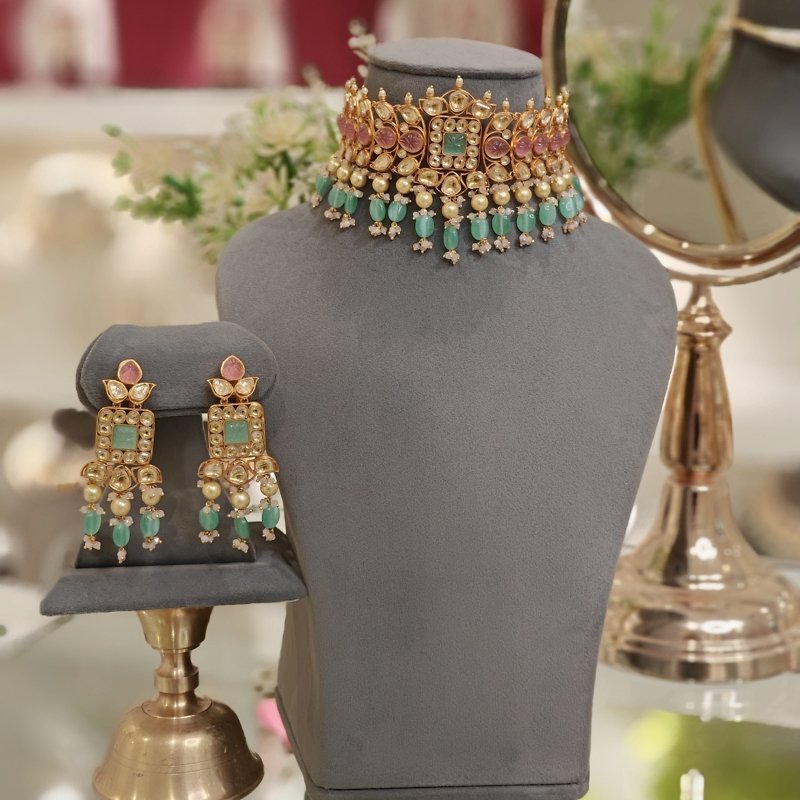 The Poorvi choker set is crafted using the finest uncut golden polki with hand carved sea green & pink jade like stones , which is then plated with 22 kt gold to add more charm to it. To create this piece more beautiful, the necklace is integrated with lovely sea green and pink beads .
