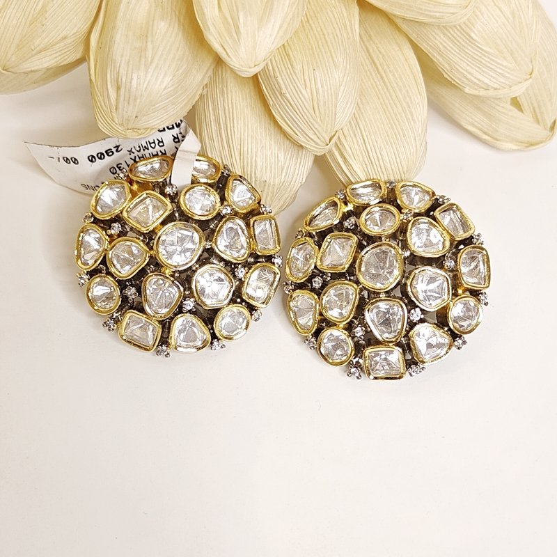 These large studs feature uncut lab grown Polki gems, plated in white and gold rhodium, these studs create a luxurious and elegant look.