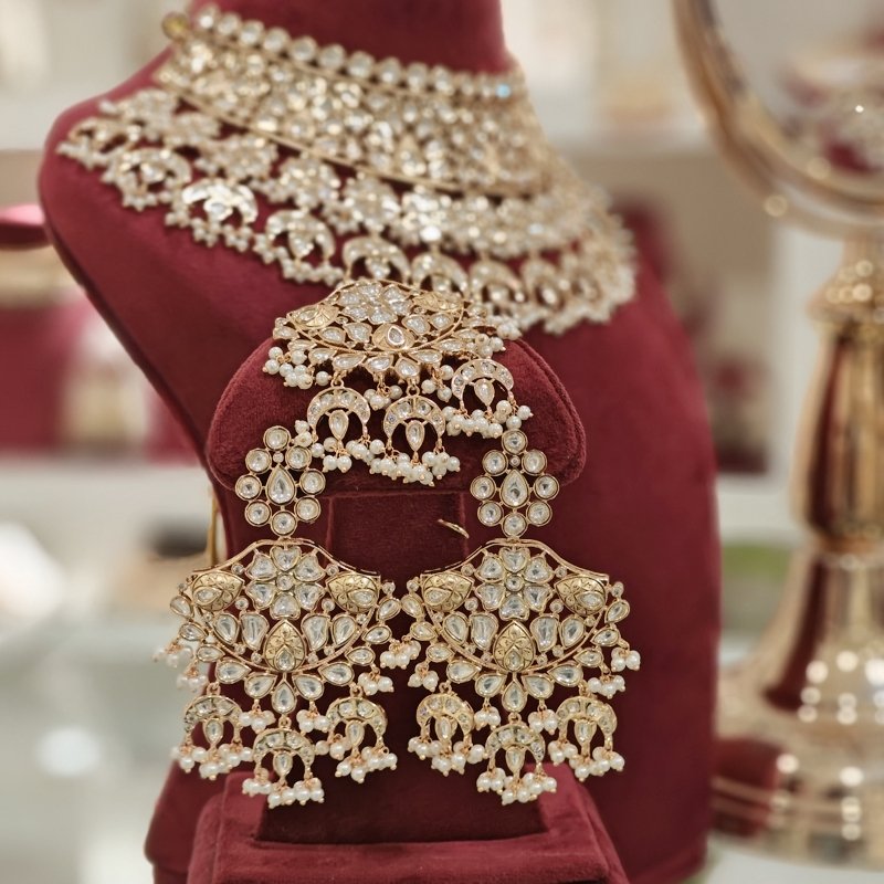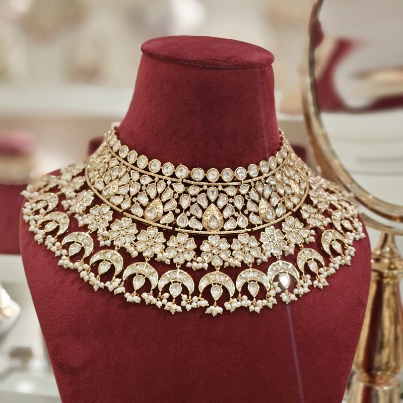 This sensational necklace set features an exquisite 18 karat gold plating, complete with a stunning polki neckline design. The charming antique work finish is beautifully accented by tiny pearls , giving it a captivating and feminine touch.