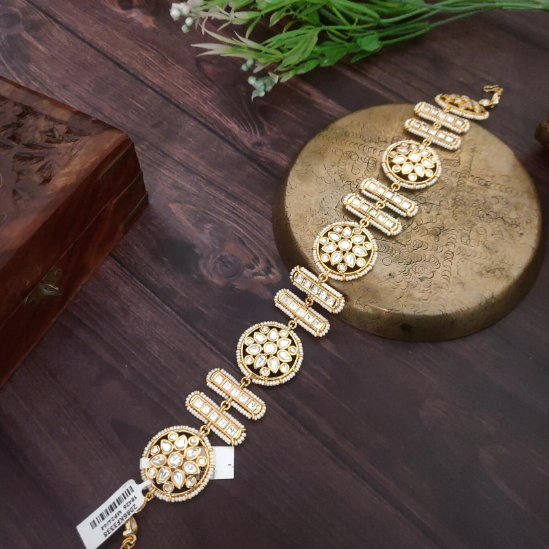 Sun design uncut polki sheeshaptti that is layered multiple times with micro pearls. To add to its rich appeal, it has been elegantly plated in 22 karat gold.
