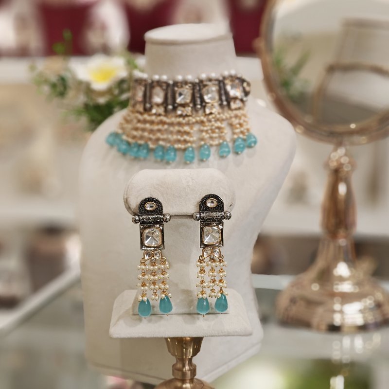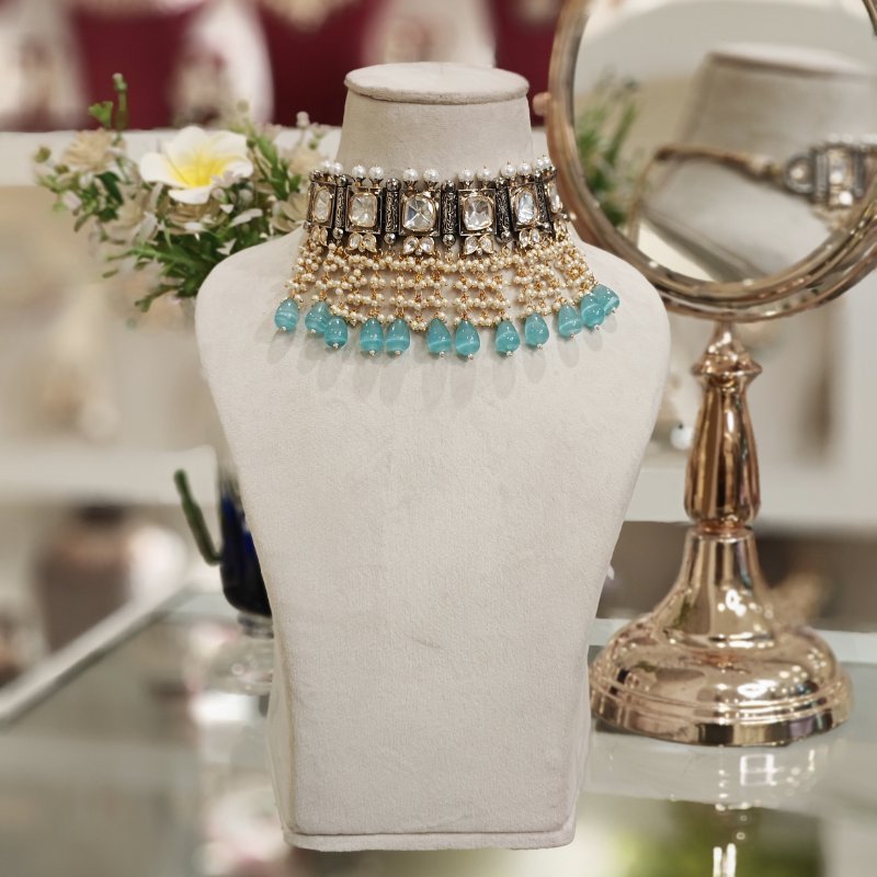 A choker set, gleaming with an antique black finish, is embellished with delicately strung micro pearls and drops of blue-hued beads. Polki and CZ stones stud the piece, with the addition of lengthier danglers.