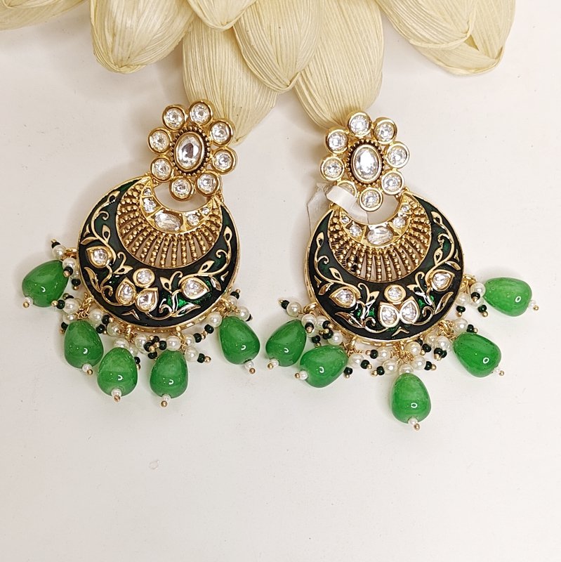 22 kt gold plated uncut polki earrings beaded with green drops .