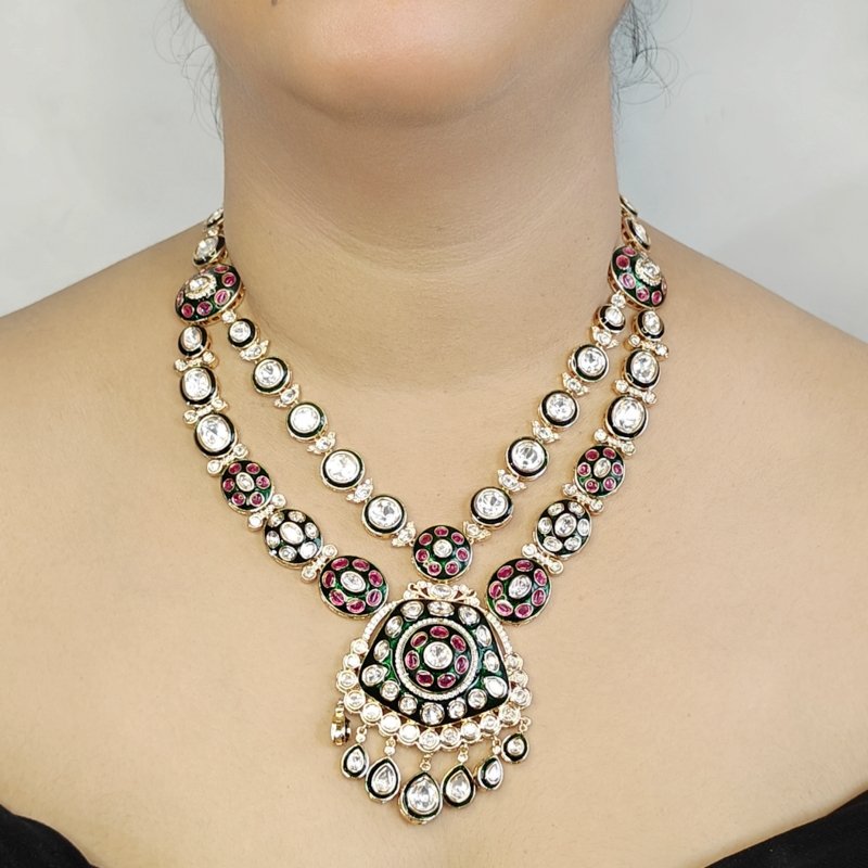This exquisite mid-length necklace set showcases a unique fusion design, combining the brilliance of cubic zirconia (CZ), Polki stones , and vibrant ruby red Pota stones. The pieces are elegantly framed by intricate green enamel work and detailed with delicate micro pearls along the outline, adding a touch of timeless elegance. The set includes a pair of matching dangling earrings and a beautifully designed Maang Tikka, making it the perfect choice for any special occasion.
