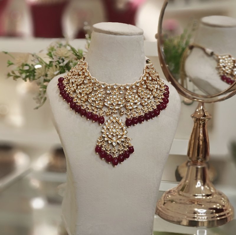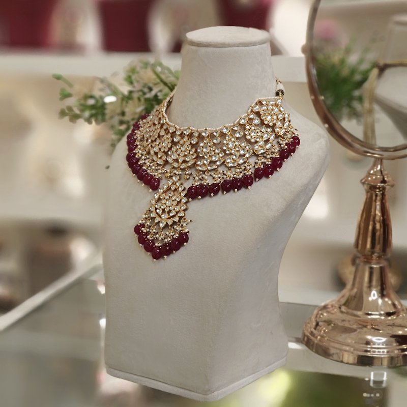 The exquisite bridal set is masterfully crafted using the finest quality paachi kundan and adorned with the timeless charm of 22 kt gold plating. Every detail is expertly and painstakingly executed, with ruby coloured semi-precious beads expertly woven in, adding a regal touch of luxury to this enchantingly beautiful ensemble.