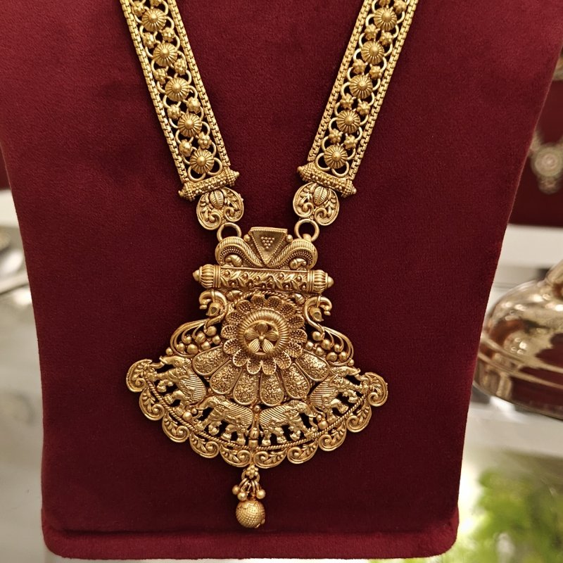 This set is Crafted in long necklace design with elepahants design and plated in antique gold polish
