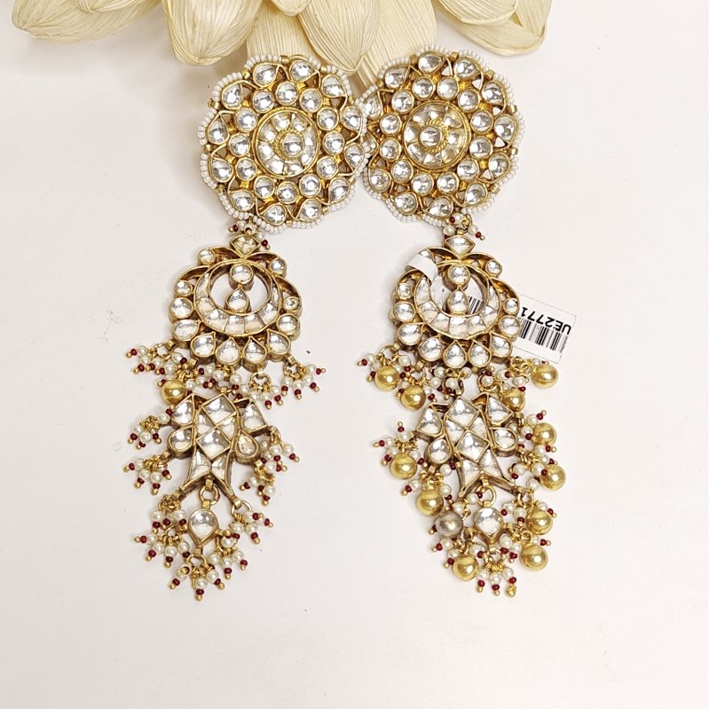 22 kt Gold plated Rabiya Earrings, Made in Ahmedabadi Paachi kundan and beaded with emerald coloured beads & pearls .