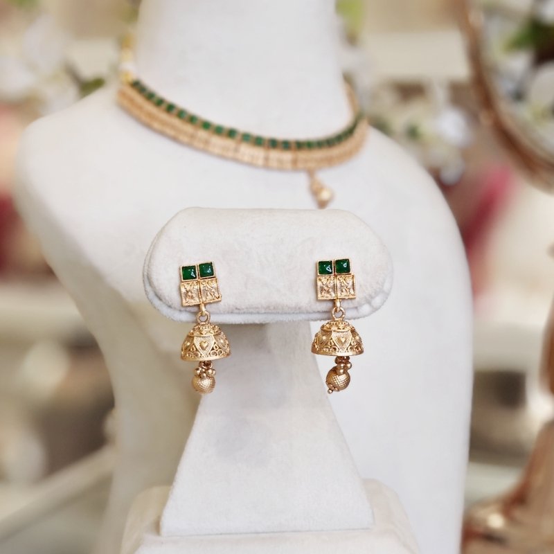 Crafted in real gold choker set design and plated in antique gold polish ,studded with green choki stones ,this set comes with a elegant jhumki